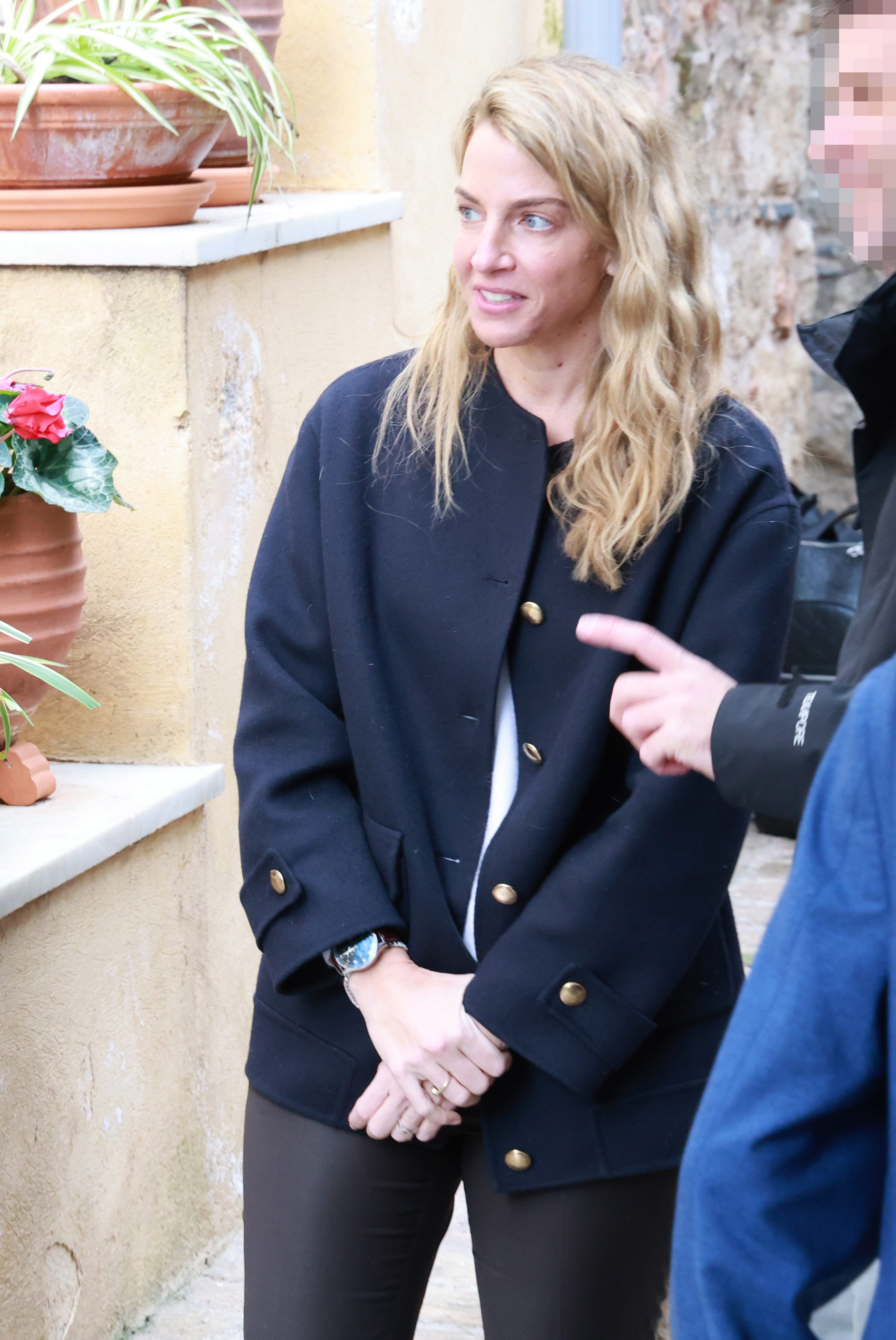 Η μέλλουσα νύφη εμφανίστηκε casual με ένα καφέ παντελόνι, ασορτί μοκασίνια, λευκή μπλούζα και μπλε κοντό σακάκι. Ήταν άβαφη και είχε τα ξανθά μαλλιά της σπαστά κάτω.