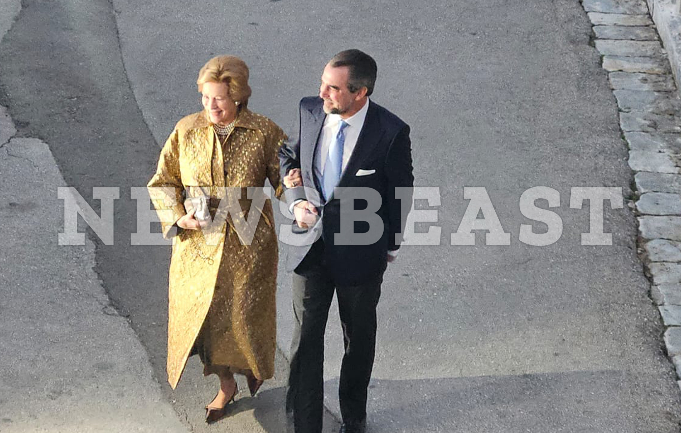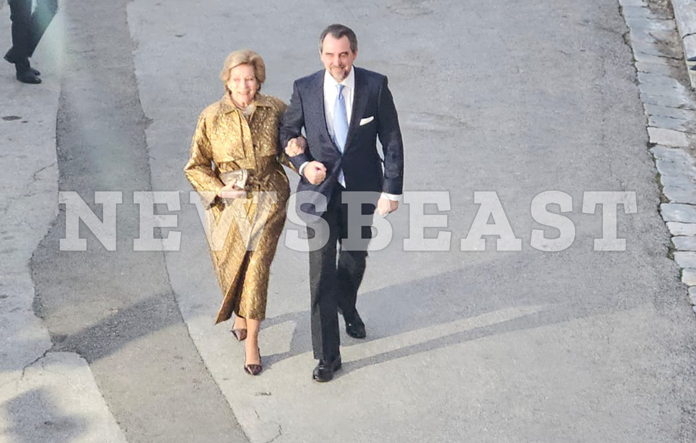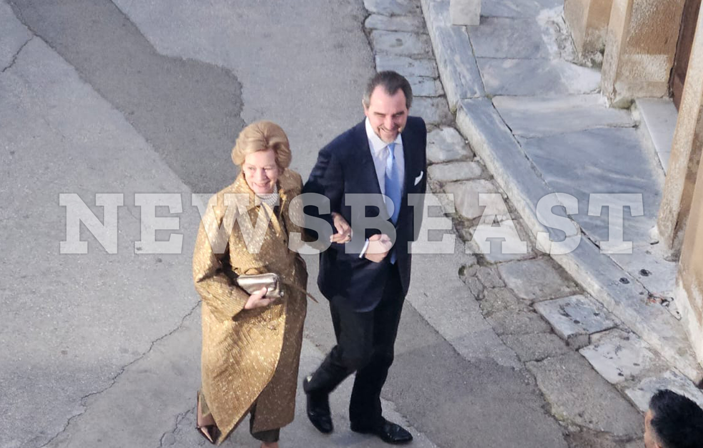 Ο 55χρονος γαμπρός ήταν πολύ κομψός, με ένα μπλε κοστούμι και μια μπλε γραβάτα, ενώ η τέως βασίλισσα επέλεξε ένα χρυσό σύνολο με πουά.