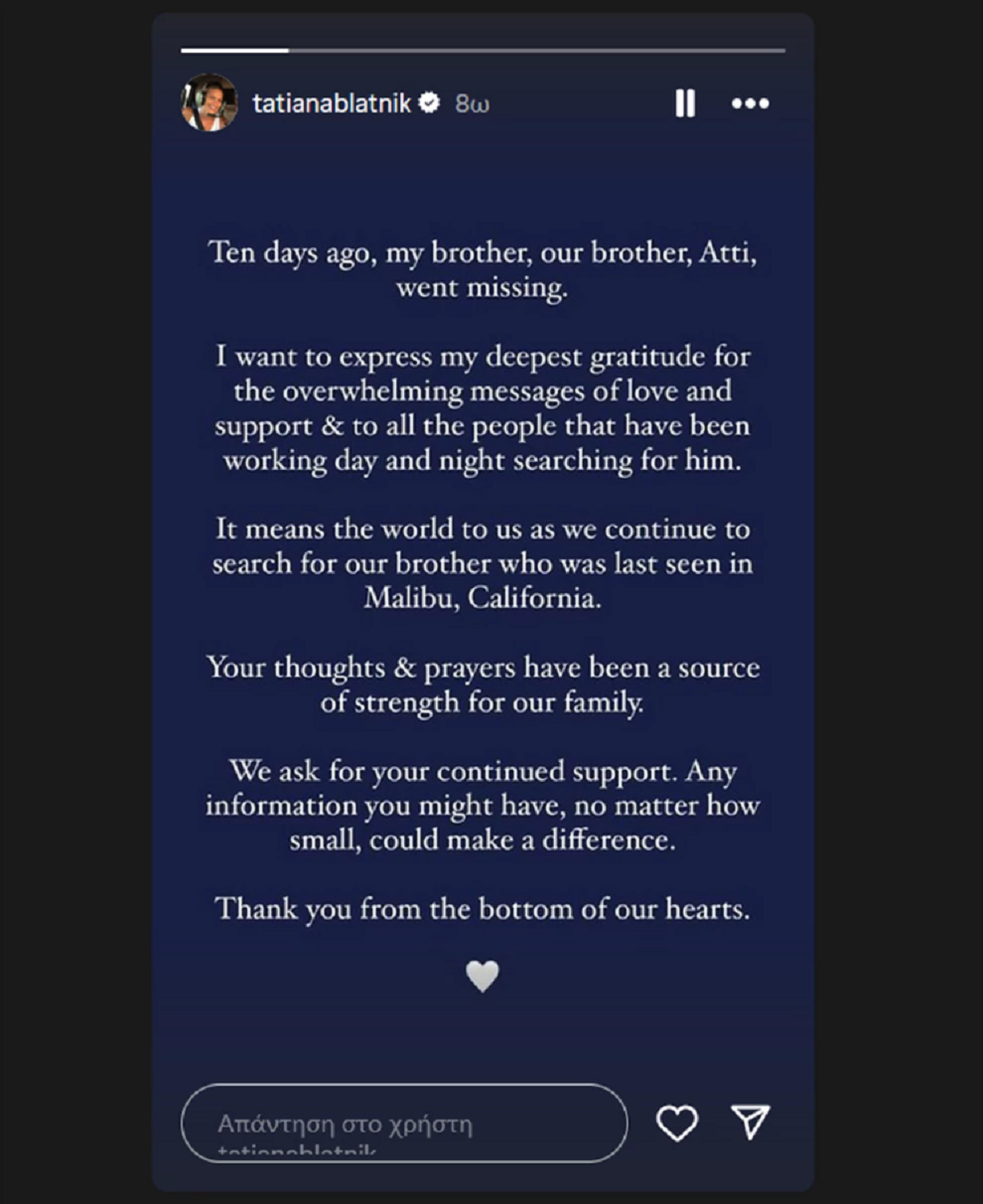 «Πριν από δέκα μέρες χάθηκε ο αδελφός μου, ο αδελφός μας, ο Άττι. Θέλω να εκφράσω τη βαθύτατη ευγνωμοσύνη μου για τα συντριπτικά μηνύματα αγάπης και υποστήριξης και σε όλους τους ανθρώπους που εργάζονται μέρα και νύχτα αναζητώντας τον.