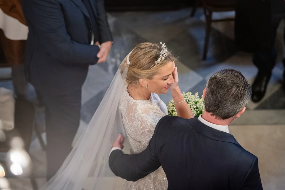 Σε μια από αυτές φαίνεται η τρυφερή στιγμή μεταξύ Νικόλαου Ντε Γκρες και Χρυσής Βαρδινογιάννη, με την απαστράπτουσα νύφη να δείχνει συγκινημένη, ενώ ο γαμπρός της δείχνει τη στοργή του αγκαλιάζοντας την απαλά στην πλάτη.