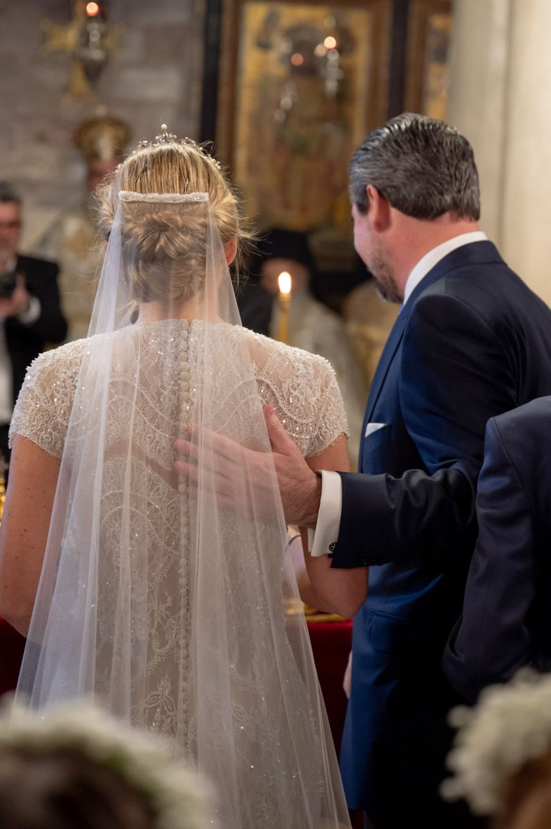 Η Χρυσή Βαρδινογιάννη εντυπωσίασε με το κομψό νυφικό της φόρεμα και την Antique Corsage Tiara που ανήκει στην πρώην βασίλισσα Άννα-Μαρία και είχε φορέσει και η πρώην σύζυγος του Νικόλαου Ντε Γκρες, Τατιάνα Μπλάτνικ. Πρόκειται για μια τιάρα που φορούν, κυρίως, οι νύφες που δεν έχουν γεννηθεί με βασιλικό ή πριγκιπικό τίτλο.