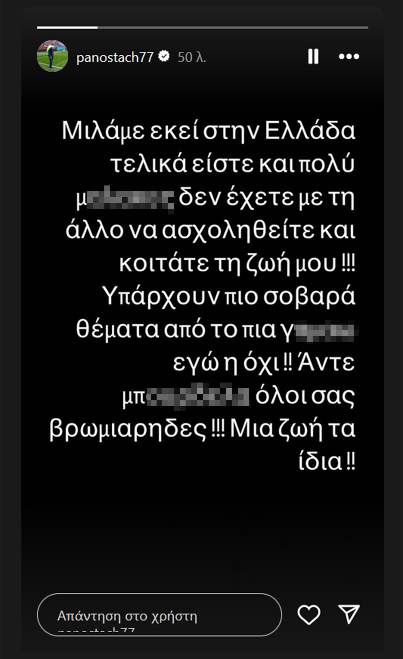 «Μιλάμε εκεί στην Ελλάδα τελικά είστε και πολύ μ…ες. Δεν έχετε με τι άλλο να ασχοληθείτε και κοιτάτε τη ζωή μου. Υπάρχουν πιο σοβαρά θέματα από το ποια γ…ω εγώ ή όχι. Άντε μπ… όλοι σας, βρωμιάρηδες. Μια ζωή τα ίδια», έγραψε.