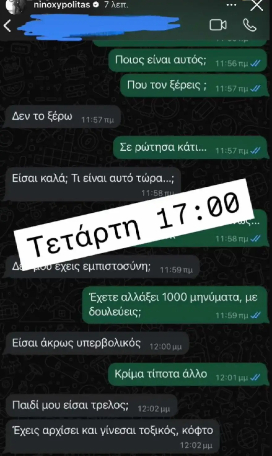 «Ποιος είναι αυτός; Πού τον ξέρεις; Έχετε αλλάξει 1.000 μηνύματα, με δουλεύεις;» ρώτησε ο τραγουδιστής σε μηνύματα που έστειλε, με την άλλη πλευρά να του απαντά: «Είσαι τρελός, τοξικός και άκρως υπερβολικός».