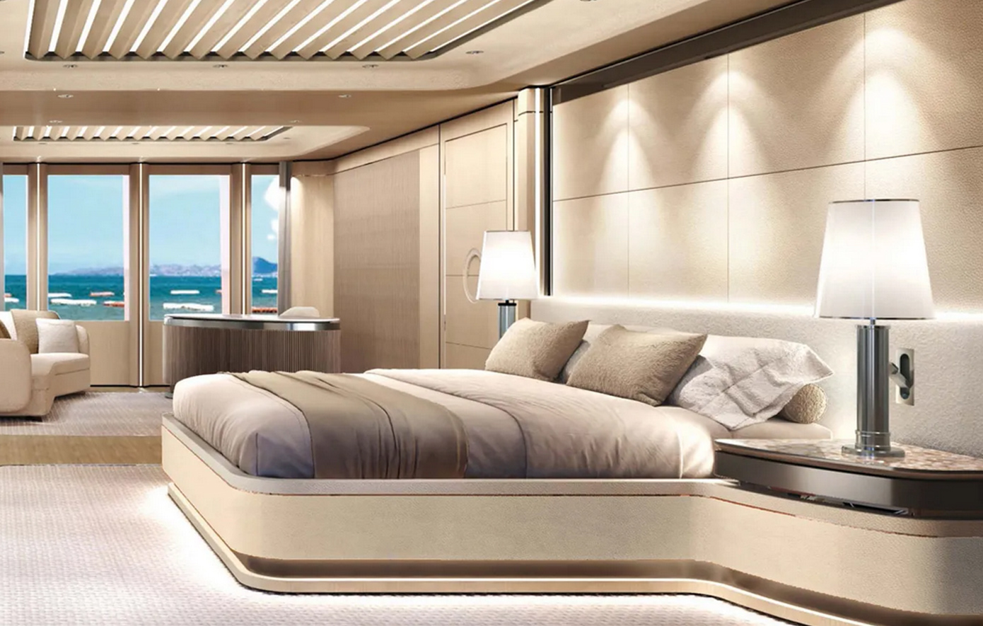 Πάνω στο σκάφος υπάρχουν τέσσερις καμπίνες επισκεπτών που βρίσκονται στο πρώτο κατάστρωμα και η πέμπτη καμπίνα VIP βρίσκεται στο υψηλότερο κατάστρωμα. Η σουίτα του ιδιοκτήτη βρίσκεται στο κεντρικό κατάστρωμα και περιλαμβάνει μεγάλη γκαρνταρόμπα και μαρμάρινες λεπτομέρειες στο ιδιωτικό μπάνιο.
