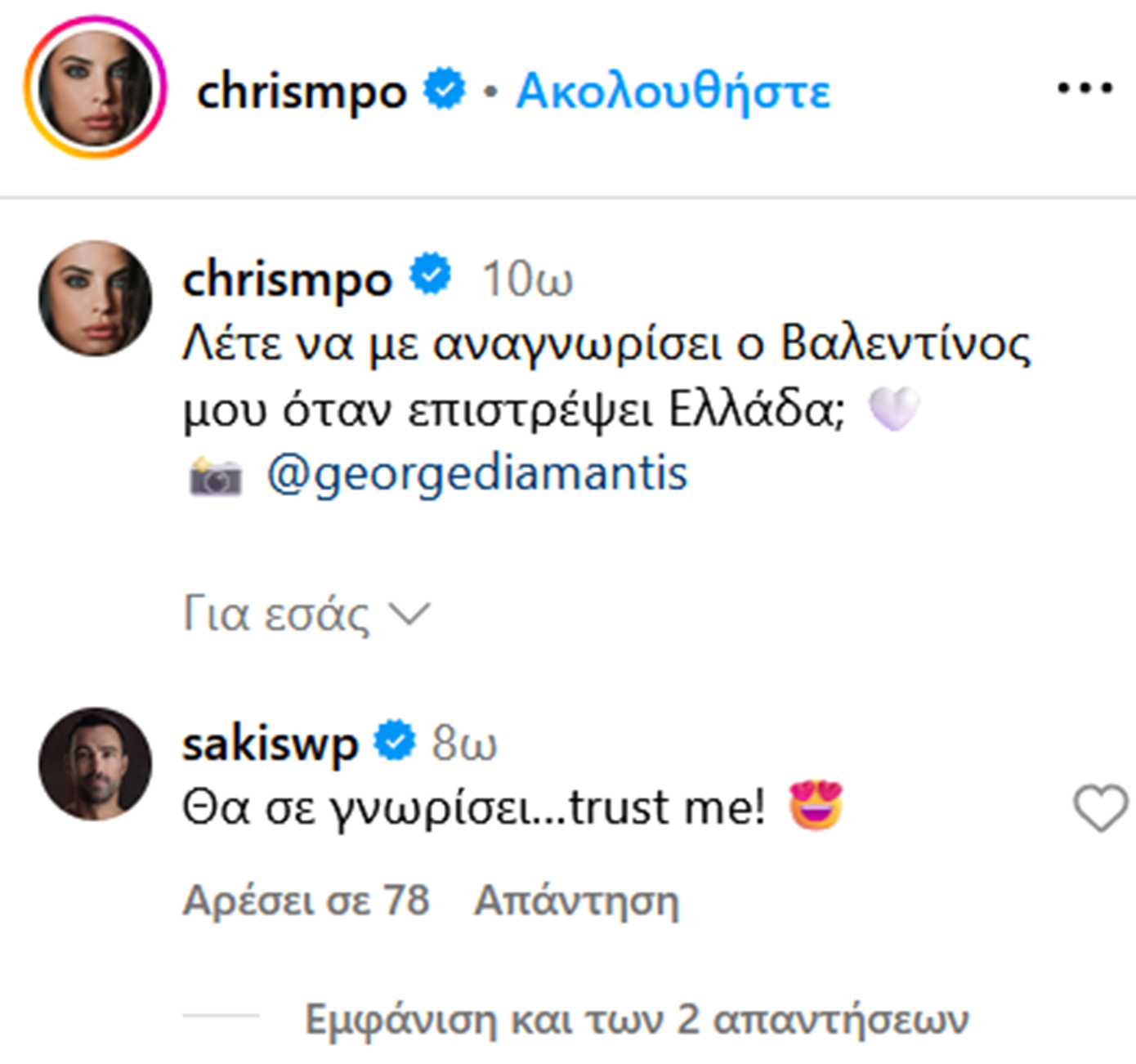«Λέτε να με αναγνωρίσει ο Βαλεντίνος μου όταν επιστρέψει Ελλάδα», έγραψε η Χριστίνα Μπόμπα στην ανάρτησή της και ο Σάκης Τανιμανίδης απάντησε: «Θα σε γνωρίσει, πίστεψέ με».