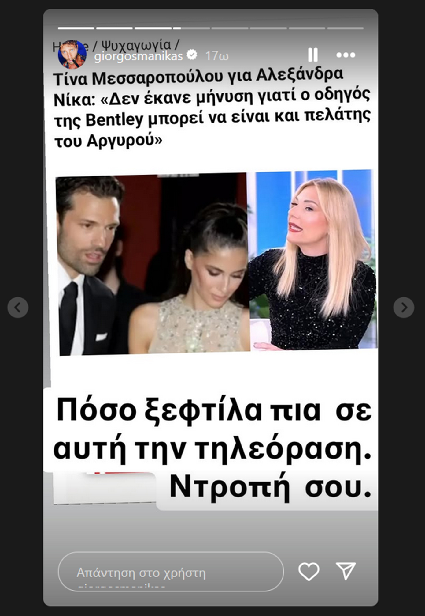 Η Τίνα Μεσσαροπούλου δεν δίστασε να σχολιάσει την απόφαση της συντρόφου του Κωνσταντίνου Αργυρού, Αλεξάνδρας Νίκα, να μην κινηθεί νομικά εναντίον του οδηγού της Bentley, προκαλώντας το ξέσπασμα του Γιώργου Μανίκα στο Instagram.