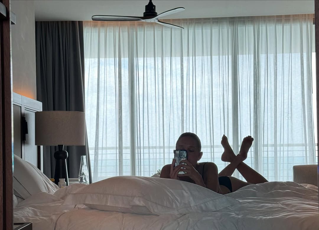 \ Ανάμεσα στις φωτογραφίες ανέβασε και μια στην οποία ποζάρει στον καθρέφτη ξαπλωμένη στο κρεβάτι της με τα εσώρουχά της.