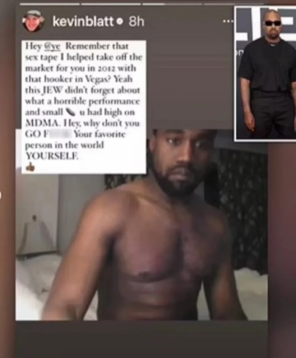 «Γεια σου, @ye. Θυμάσαι το σεξουαλικό βίντεο που βοήθησα να εξαφανιστεί το 2012 με εκείνη την ιερόδουλη στο Λας Βέγκας; Ναι, αυτός ο Εβραίος δεν το ξέχασε, ούτε πόσο χάλια είσαι στο σεξ, ούτε πόσο μικρό πέος έχεις από το MDMA. Γιατί δεν πας να γ… το πιο αγαπημένο άτομο που έχεις στον κόσμο, τον εαυτό σου;».