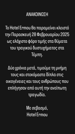 Όπως αναφέρει η ανακοίνωση του νυχτερινού κέντρου: «Το Hotel Ermou θα παραμείνει κλειστό την Παρασκευή 28 Φεβρουαρίου 2025 ως ελάχιστο φόρο τιμής στα θύματα του τραγικού δυστυχήματος στα Τέμπη.