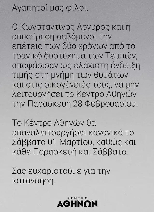 Ανάλογη ανακοίνωση έβγαλε και το κέντρο στο οποίο εμφανίζεται ο Κωνσταντίνος Αργυρός.