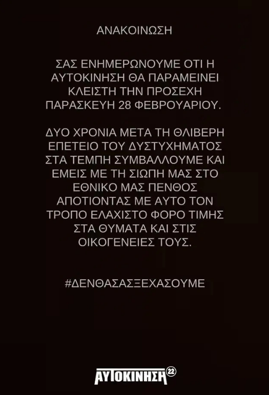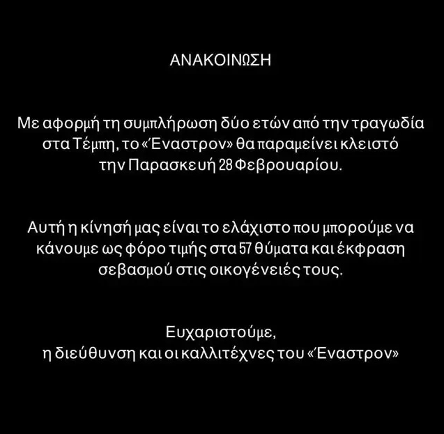 «Αυτό είναι το ελάχιστο που μπορούμε να κάνουμε ως φόρο τιμής στα 57 θύματα και έκφραση σεβασμού στις οικογένειες τους» αναφέρει μεταξύ άλλων η ανακοίνωση του Έναστρον στο οποίο εμφανίζονται η Ελένη Φουρέιρα, ο Χρήστος Μάστορας και οι Μέλισσες.