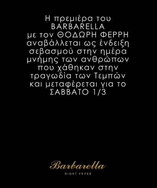 Ο Θοδωρής Φέρρης που εκείνη την ημέρα είχε προγραμματίσει την πρεμιέρα του στο Barbarella, αποφάσισε να την μεταφέρει την επόμενη ημέρα.