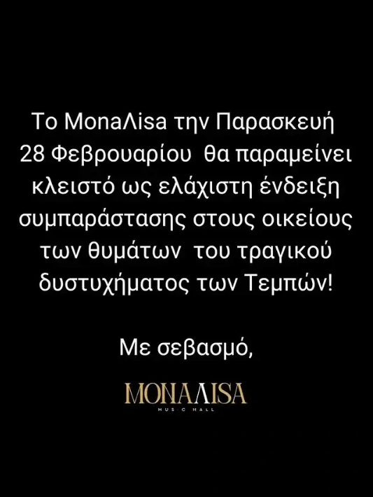 Την αρχή έκανε χθες η Άννα Βίσση η οποία με ανακοίνωση του κέντρου που εμφανίζεται έκανε γνωστό πως την Παρασκευή ως ελάχιστο φόρο τιμής στα θύματα του τραγικού δυστυχήματος στα Τέμπη, το Hotel Ermou, δεν θα λειτουργήσει.