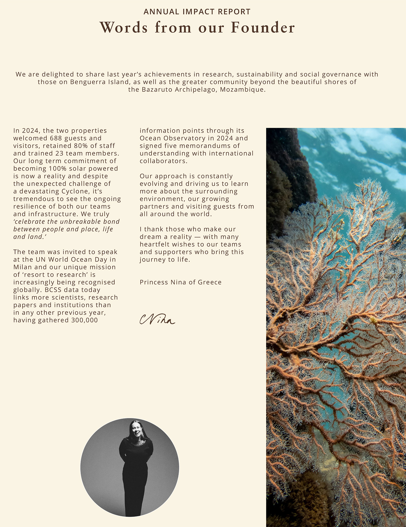 Ο τρόπος με τον οποίο υπέγραψε η Νίνα Φλορ την ετήσια έκθεση του πολυτελούς θερέτρου της στη Μοζαμβίκη δεν πέρασε απαρατήρητος, καθώς επέλεξε να χρησιμοποιήσει τον τίτλο «Πριγκίπισσα της Ελλάδας», αντί για το επώνυμο του συζύγου της Φίλιππου Ντε Γκρες.
