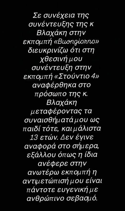 «Σε συνέχεια της συνέντευξης της κ. Βλαχάκη στην εκπομπή “Buongiorno” διευκρινίζω ότι στη χθεσινή μου συνέντευξη στην εκπομπή “Στούντιο 4” αναφέρθηκα στο πρόσωπο της κ. Βλαχάκη μεταφέροντας τα συναισθήματά μου ως παιδί τότε και μάλιστα 13 ετών. Δεν έγινε αναφορά στο σήμερα, εξάλλου, όπως η ίδια ανέφερε στην ανωτέρω εκπομπή, η αντιμετώπισή μου είναι πάντοτε ευγενική με ανθρώπινο σεβασμό» έγραψε ο γιος του Στράτου Διονυσίου.