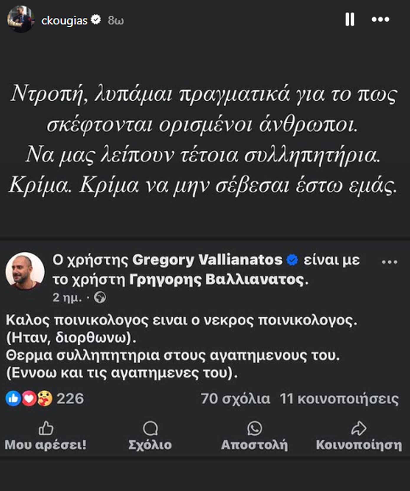 Τα αισχρά σχόλια του Γρηγόρη Βαλλιανάτου μετά τον θάνατο του Αλέξη Κούγια προκάλεσαν την αντίδραση του γιου του γνωστού ποινικολόγου, Χρίστου, ο οποίος μέσω Instagram Story έδωσε τη δική του απάντηση.