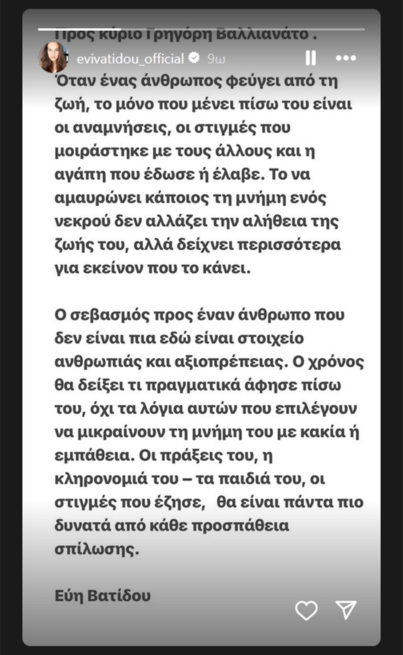 Το βράδυ της Τετάρτης 6 Μαρτίου, η Εύη Βατίδου δεν έμεινε σιωπηλή. Μέσα από τον προσωπικό της λογαριασμό στο Instagram, σχολίασε πως τα λόγια και οι ενέργειες του Γρηγόρη Βαλλιανάτου αντικατοπτρίζουν την ποιότητά του ως άνθρωπο.