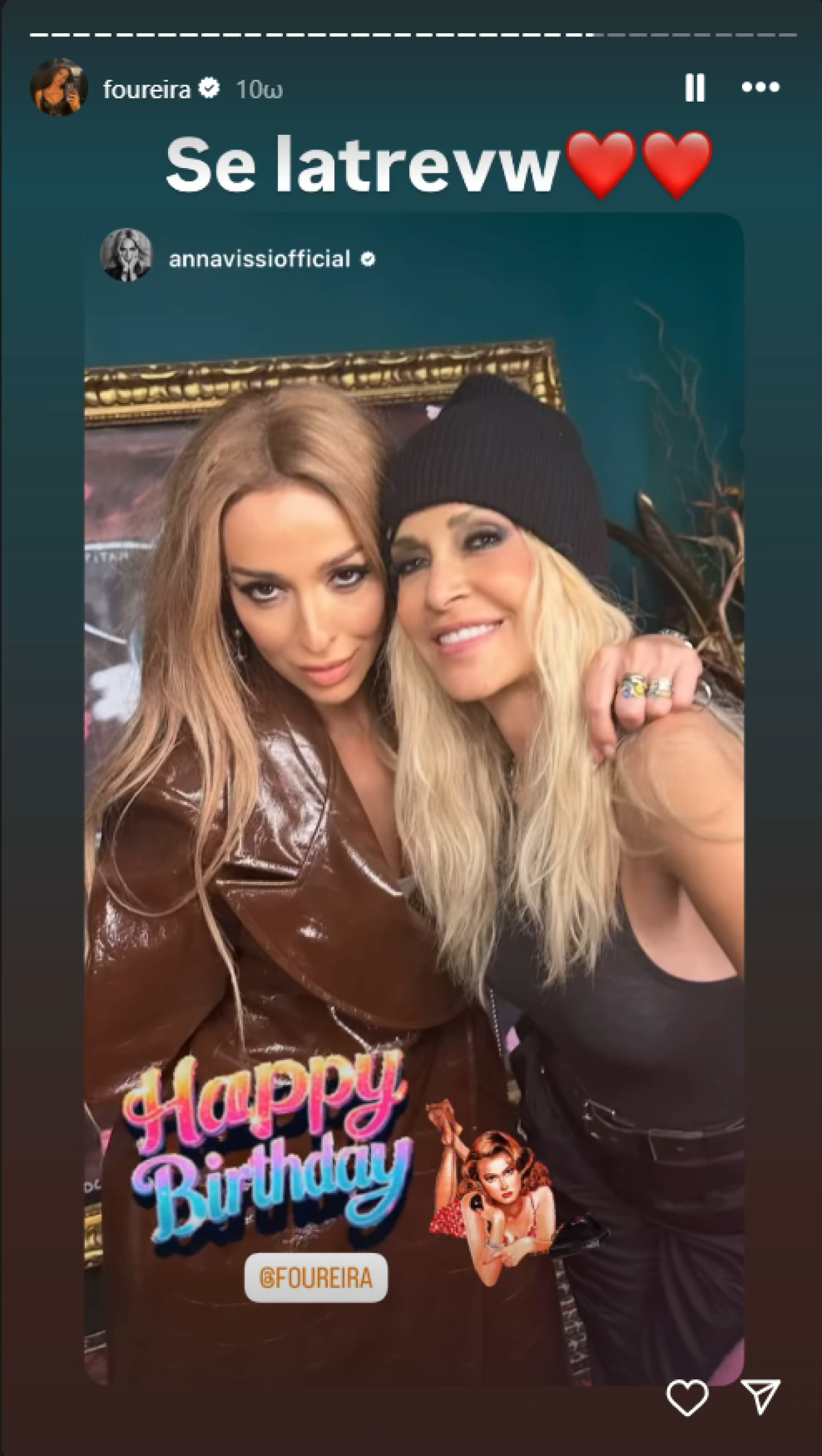Τα γενέθλιά της γιόρτασε την Παρασκευή 7 Μαρτίου η Ελένη Φουρέιρα, με αρκετούς επώνυμους να της στέλνουν θερμές ευχές μέσω των social media. Ανάμεσα σε αυτούς, και η Άννα Βίσση, η οποία έκανε μια ξεχωριστή ανάρτηση στο Instagram, δείχνοντας τη συμπάθεια και την εκτίμησή της προς τη συνάδελφό της.