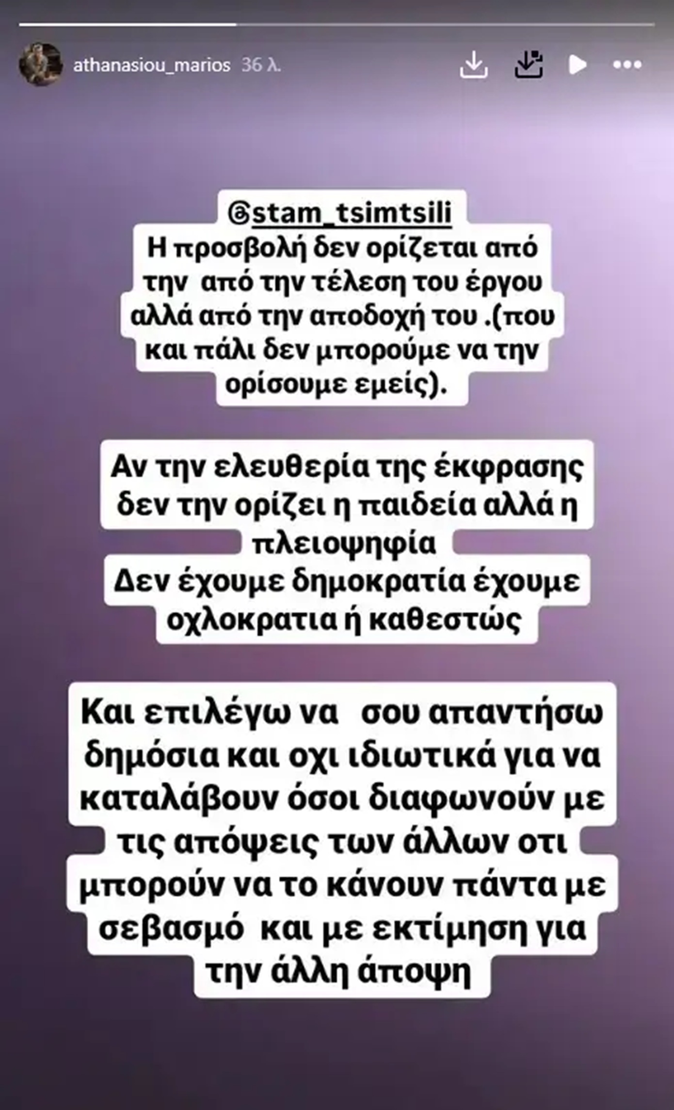 Και επιλέγω να σου απαντήσω δημόσια και όχι ιδιωτικά για να καταλάβουν όσοι διαφωνούν με τις απόψεις των άλλων ότι μπορούν να το κάνουν πάντα με σεβασμό και με εκτίμηση για την άλλη άποψη». έγραψε ο Μάριος Αθανασίου.