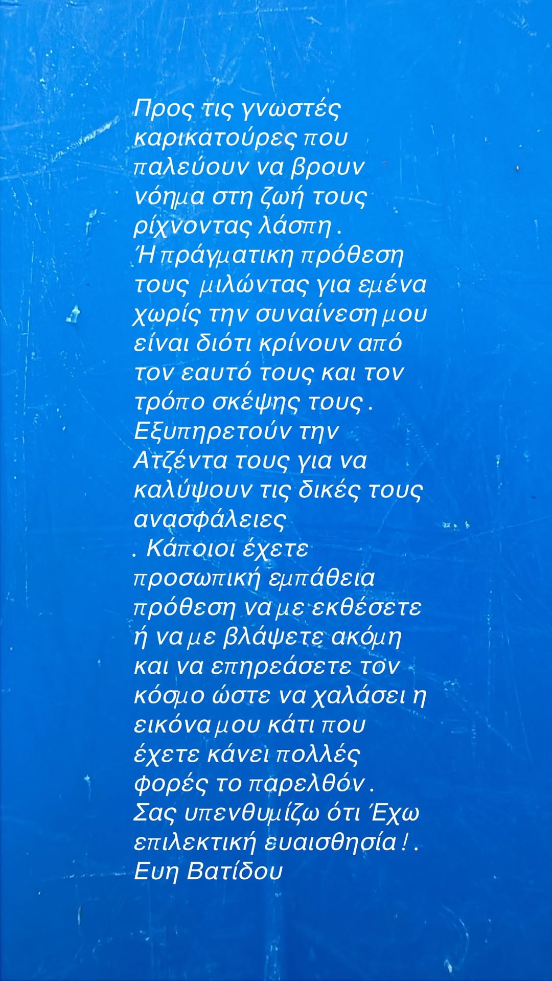 Ένα μακροσκελές μήνυμα γεμάτο αιχμές και καταγγελίες ανήρτησε η Εύη Βατίδου στον προσωπικό της λογαριασμό στο Instagram, εκφράζοντας την έντονη δυσαρέσκειά της για την κατάσταση που βιώνει.
