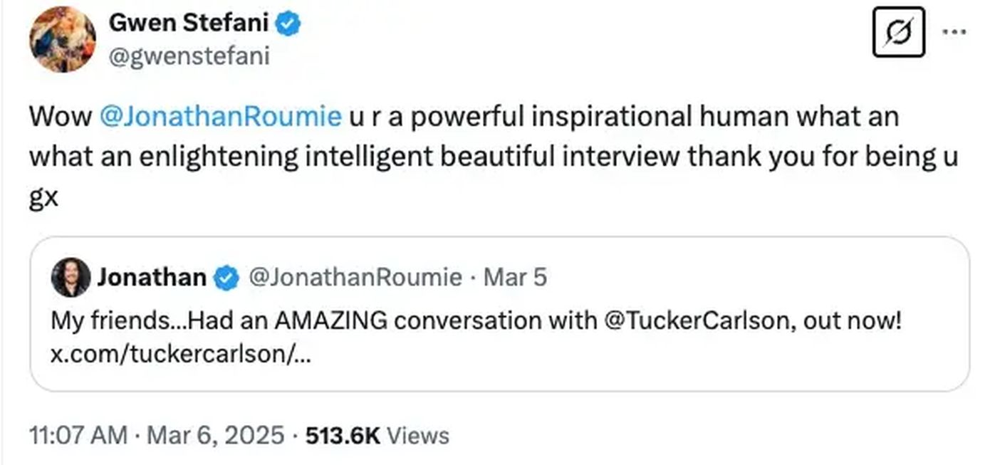 H Γκουέν Στεφάνι προκάλεσε μεγάλη αναστάτωση στους αριστερούς θαυμαστές της αφού μοιράστηκε ένα βίντεο από μια συνέντευξη του αμερικανού, συντηρητικού παρουσιαστή, Τάκερ Κάρλσον, όπου συζητούσε για τον χριστιανισμό με τον ηθοποιό Τζόναθαν Ρούμι.