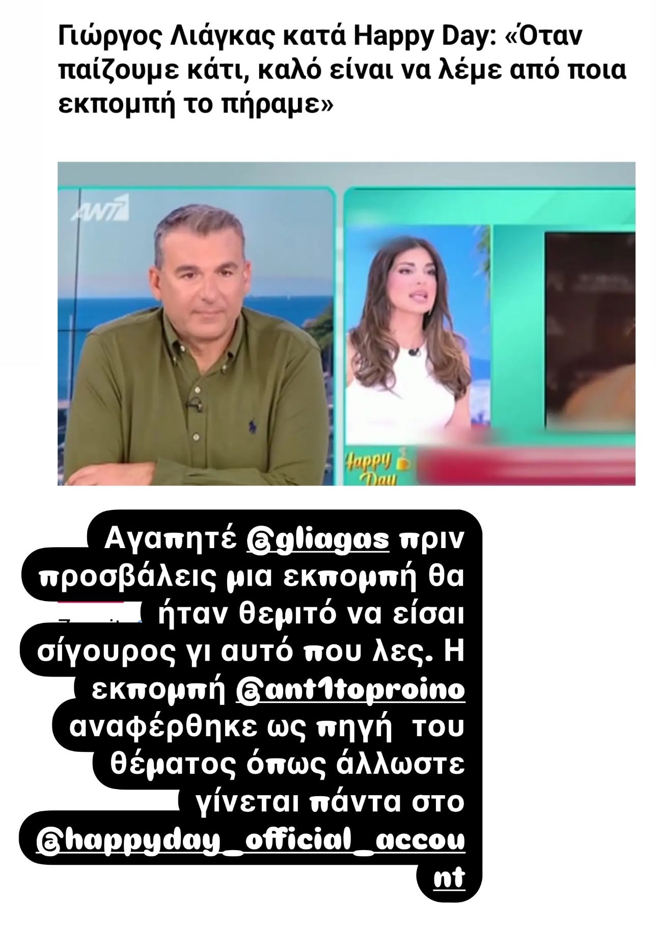«Αγαπητέ Γιώργο Λιάγκα, καλό είναι πριν προσβάλεις μια εκπομπή, θα ήταν θεμιτό να είσαι σίγουρος γι’ αυτό που λες. Η εκπομπή “Το Πρωινό” αναφέρθηκε ως πηγή του θέματος, όπως άλλωστε συμβαίνει πάντα στο Happy Day», έγραψε η παρουσιάστρια.