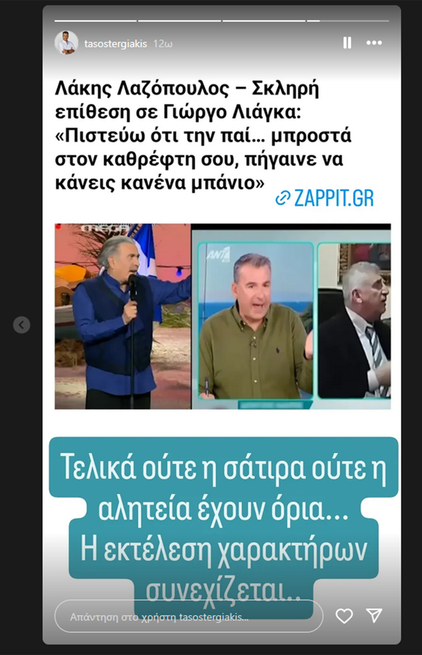 Ο δημοσιογράφος, βλέποντας το σχετικό απόσπασμα, κοινοποίησε δημοσίευμα που αναφερόταν στις ατάκες του Λάκη Λαζόπουλου, συνοδεύοντάς το με ένα αιχμηρό σχόλιο: «Τελικά ούτε η σάτιρα, ούτε η αλητεία έχουν όρια. Η εκτέλεση χαρακτήρων συνεχίζεται».
