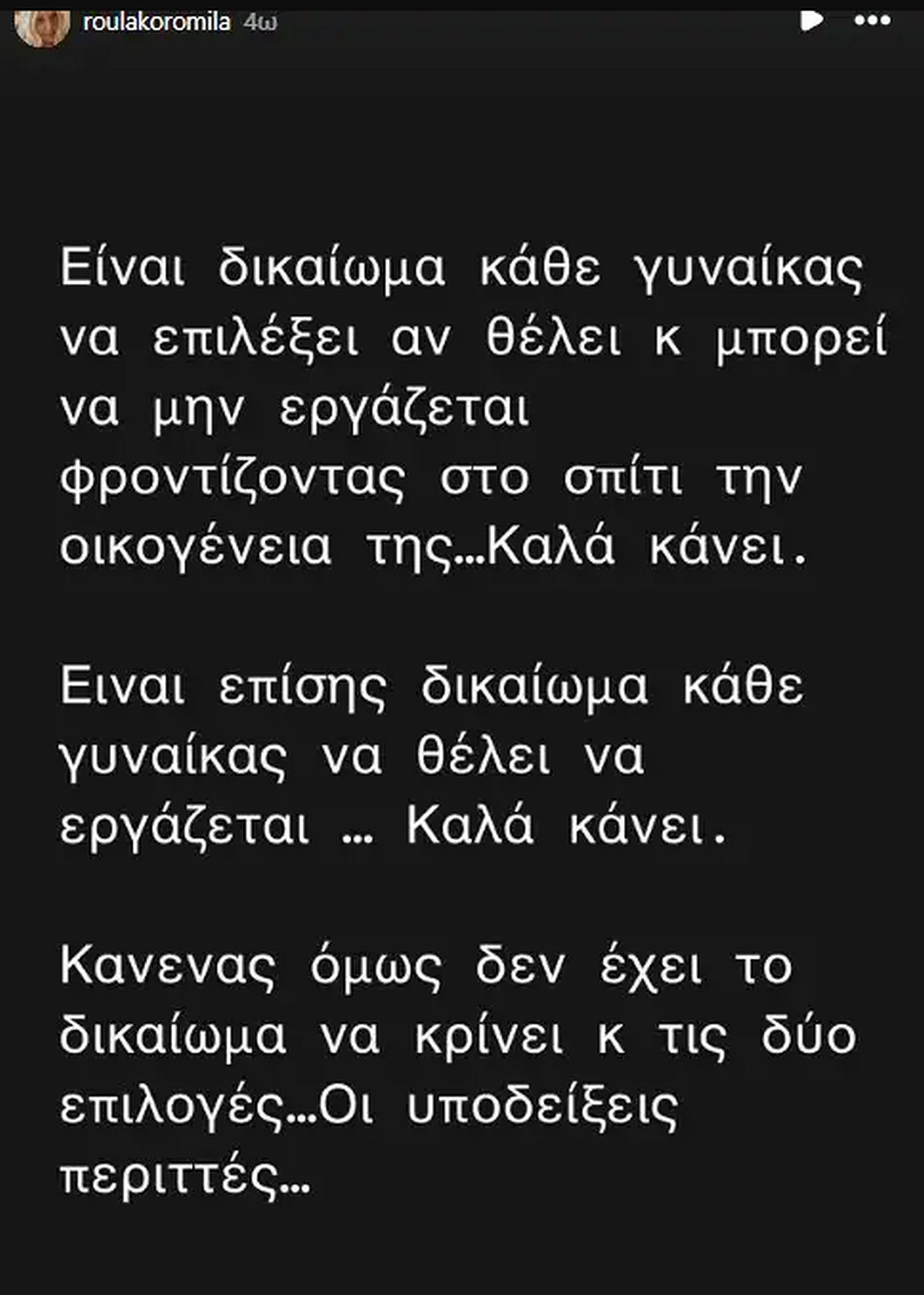 Είναι δικαίωμα κάθε γυναίκας να επιλέξει αν θέλει και μπορεί να μην εργάζεται, φροντίζοντας στο σπίτι την οικογένειά της… Καλά κάνει. Είναι επίσης δικαίωμα της κάθε γυναίκας να θέλει να εργάζεται… Καλά κάνει. Κανένας όμως δεν έχει το δικαίωμα να κρίνει και τις δύο επιλογές. Οι υποδείξεις περιττές» έγραψε χαρακτηριστικά η Ρούλα Κορομηλά.