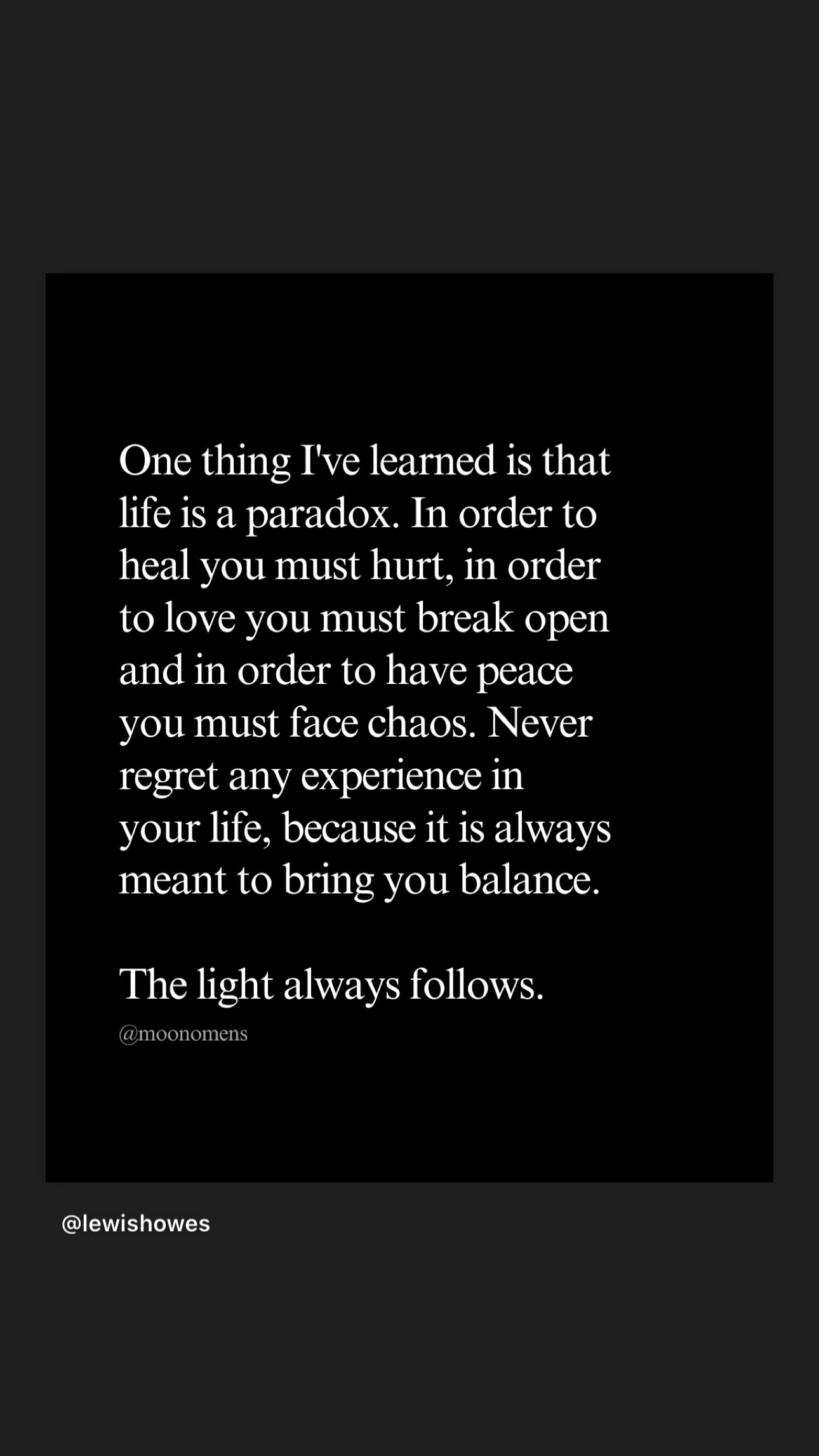«Ένα πράγμα που έμαθα είναι ότι η ζωή είναι ένα παράδοξο. Για να θεραπευτείς πρέπει να πληγωθείς, για να αγαπήσεις πρέπει να ανοιχτείς και για να έχεις ειρήνη πρέπει να αντιμετωπίσεις το χάος. Ποτέ μην μετανιώνεις για καμία εμπειρία στη ζωή σου, γιατί πάντα προορίζεται να σου φέρει ισορροπία. Το φως πάντα ακολουθεί»