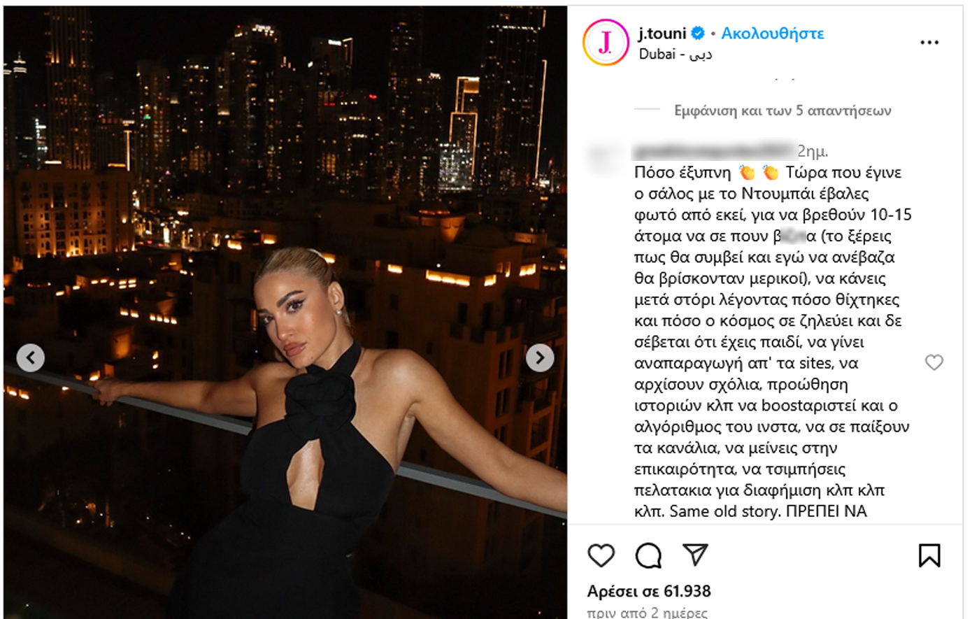 Ένας άλλος ακόλουθος σημείωσε: «Πόσο έξυπνη. Τώρα που έγινε ο σάλος με το Ντουμπάι έβαλες φωτό από εκεί, για να βρεθούν 10-15 άτομα να σε πουν β…α (το ξέρεις πως θα συμβεί και εγώ να ανέβαζα θα βρίσκονταν μερικοί), να κάνεις μετά στόρι λέγοντας πόσο θίχτηκες και πόσο ο κόσμος σε ζηλεύει και δε σέβεται ότι έχεις παιδί, να γίνει αναπαραγωγή απ’ τα sites, να αρχίσουν σχόλια, προώθηση ιστοριών κλπ να boostαριστεί και ο αλγόριθμος του ινστα, να σε παίξουν τα κανάλια, να μείνεις στην επικαιρότητα, να τσιμπήσεις πελατακια για διαφήμιση κλπ κλπ κλπ. Same old story.»