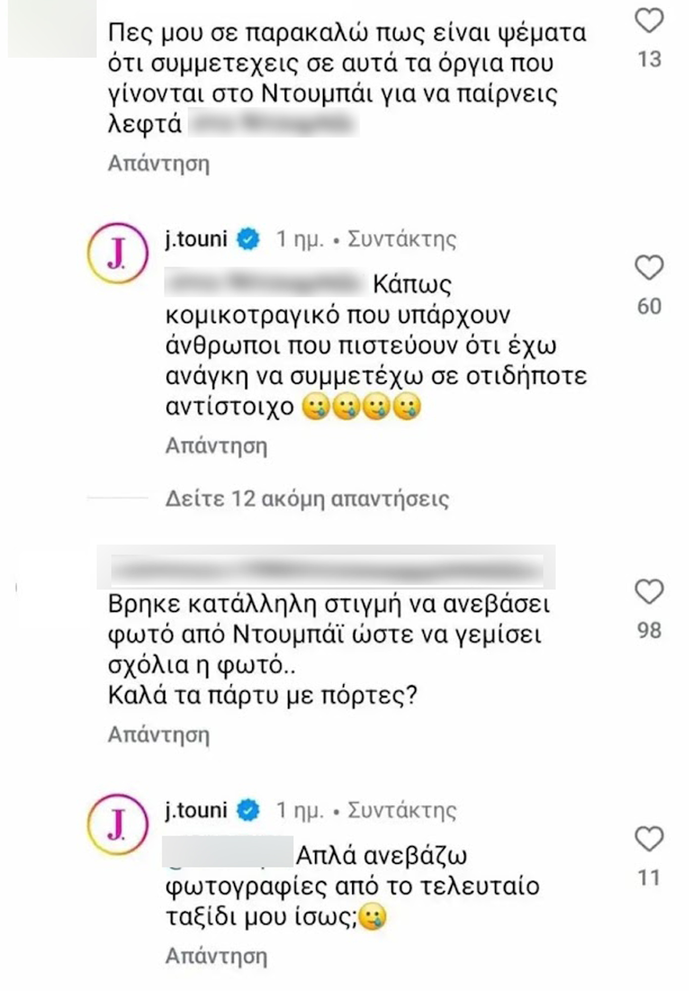 Ένας follower, την ρώτησε: «Πες μου σε παρακαλώ πως είναι ψέματα ότι συμμετέχεις σε αυτά τα όργια που γίνονται στο Ντουμπάι για να παίρνεις λεφτά» με την Ιωάννα Τούνη να απαντά: «Κωμικοτραγικό που υπάρχουν άνθρωποι που πιστεύουν ότι έχω ανάγκη να συμμετέχω σε οτιδήποτε αντίστοιχο»
