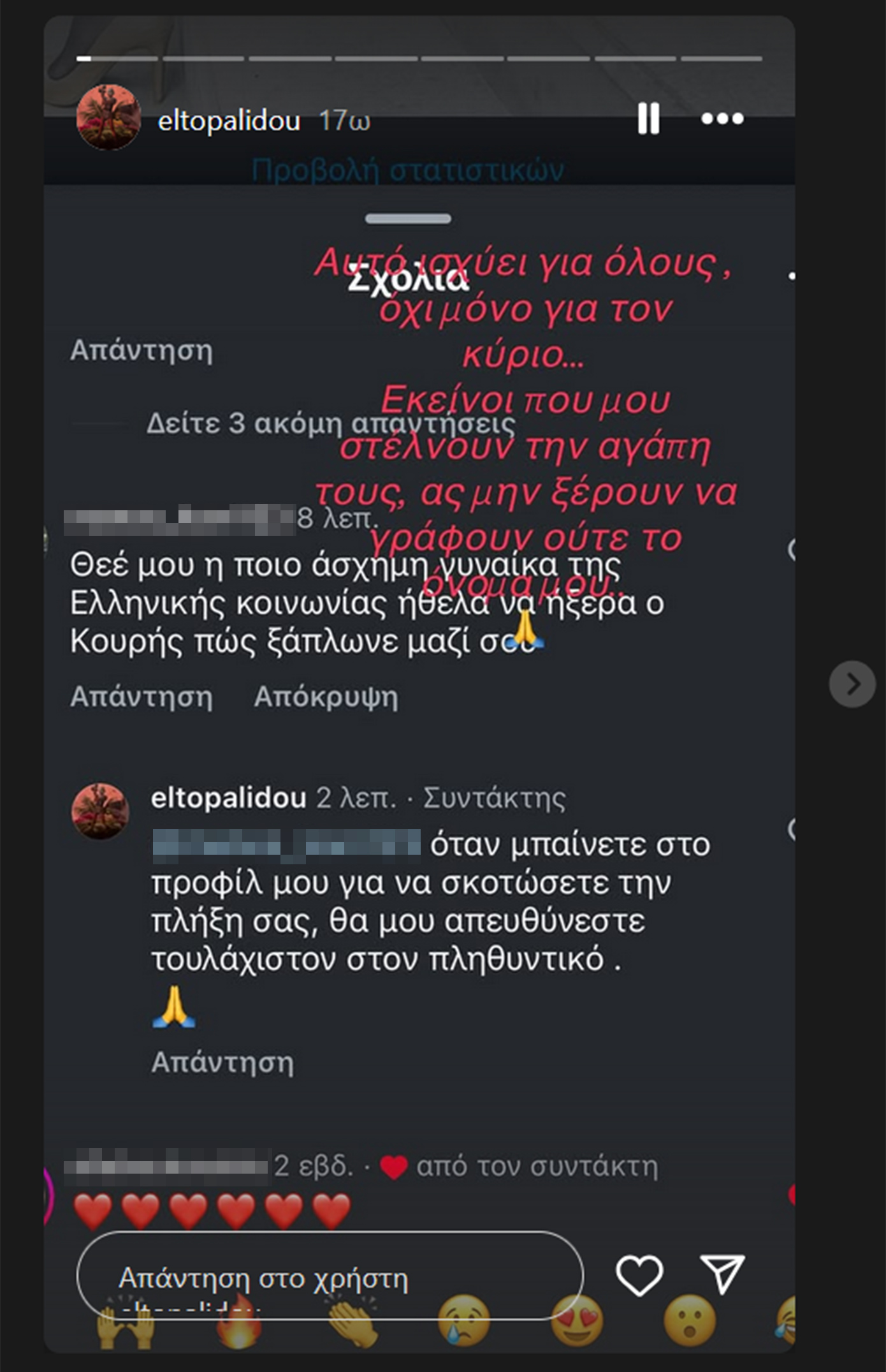 «Αυτό ισχύει για όλους, όχι μόνο για τον κύριο. Εκείνοι που μου στέλνουν την αγάπη τους, ας μην ξέρουν να γράφουν ούτε το όνομά μου», συμπλήρωσε η Έλενα Τοπαλίδου στο μήνυμα που δέχτηκε.