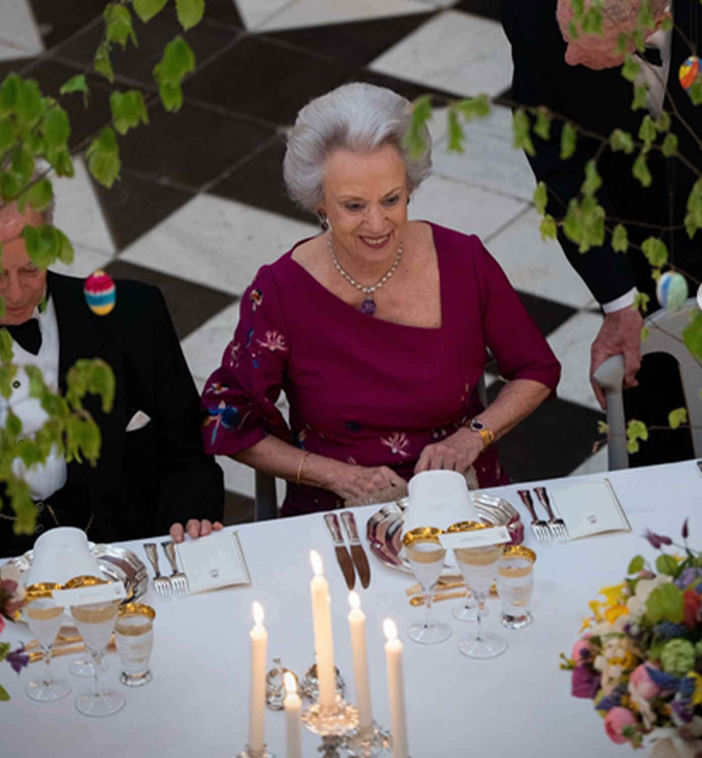 Το τραπέζι ήταν στολισμένο με φρεσκοκομμένα κλαδιά και διακοσμημένο με πασχαλινά αυγά, τα οποία η ίδια η τέως βασίλισσα έχει διακοσμήσει.