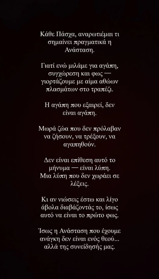 «Καλό Πάσχα, αναρωτιέμαι τι σημαίνει πραγματικά η Ανάσταση. Γιατί ενώ μιλάμε για αγάπη, συγχώρεση και φως – γιορτάζουμε με αίμα αθώων πλασμάτων στο τραπέζι. Η αγάπη που εξαιρεί, δεν είναι αγάπη. Μωρά ζώα που δεν πρόλαβαν να ζήσουν, να τρέξουν, να αγαπηθούν.