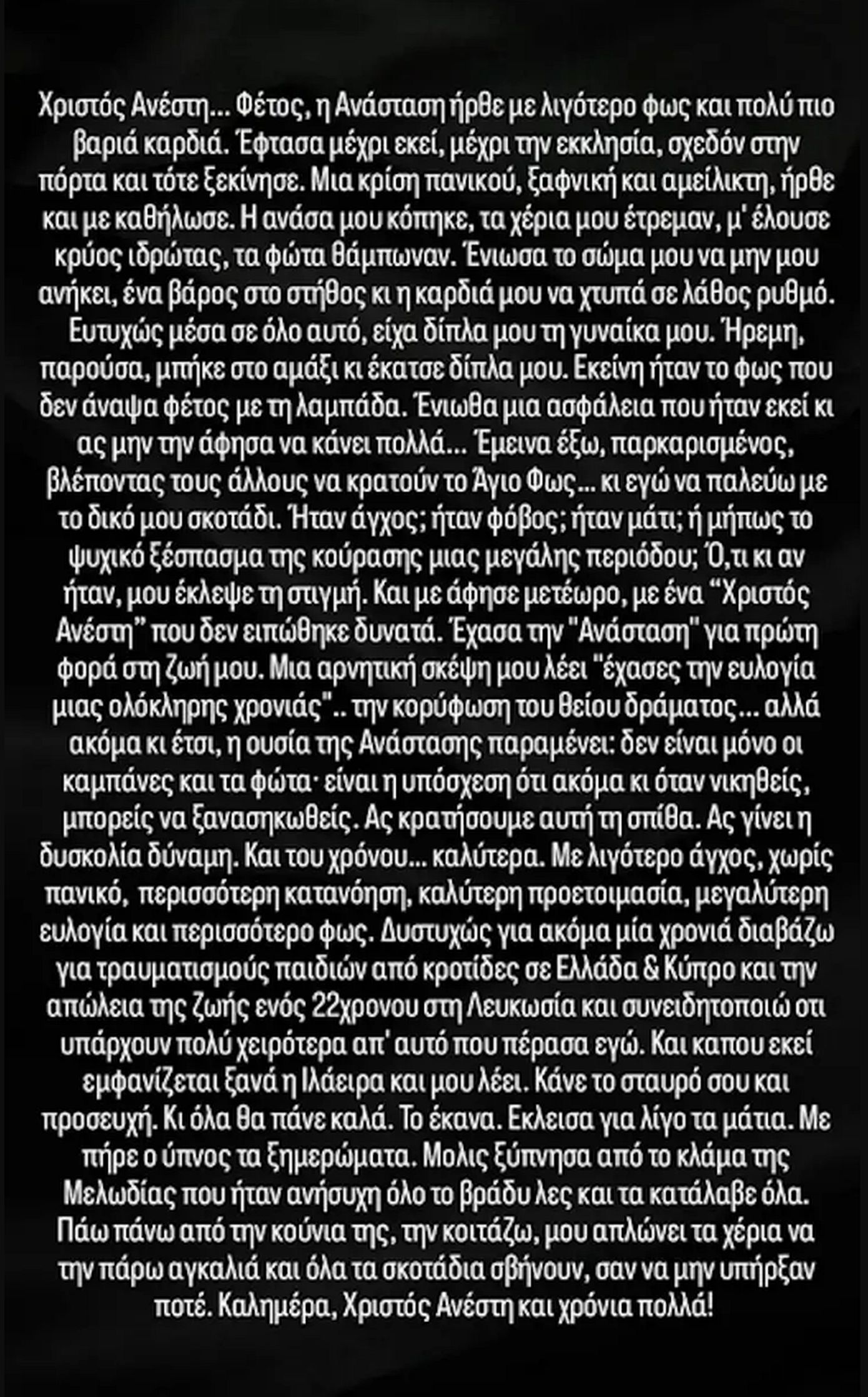 «Χριστός Ανέστη… Φέτος, η Ανάσταση ήρθε με λιγότερο φως και πολύ πιο βαριά καρδιά. Έφτασα μέχρι εκεί, μέχρι την εκκλησία, σχεδόν στην πόρτα και τότε ξεκίνησε. Μία κρίση πανικού, ξαφνική και αμείλικτη, ήρθε και με καθήλωσε. Η ανάσα μου κόπηκε, τα χέρια μου έτρεμαν, με έλουσε κρύος ιδρώτας, τα φώτα θάμπωναν» περιγράφει ο Μαυρίκιος Μαυρικίου και συνεχίζει: