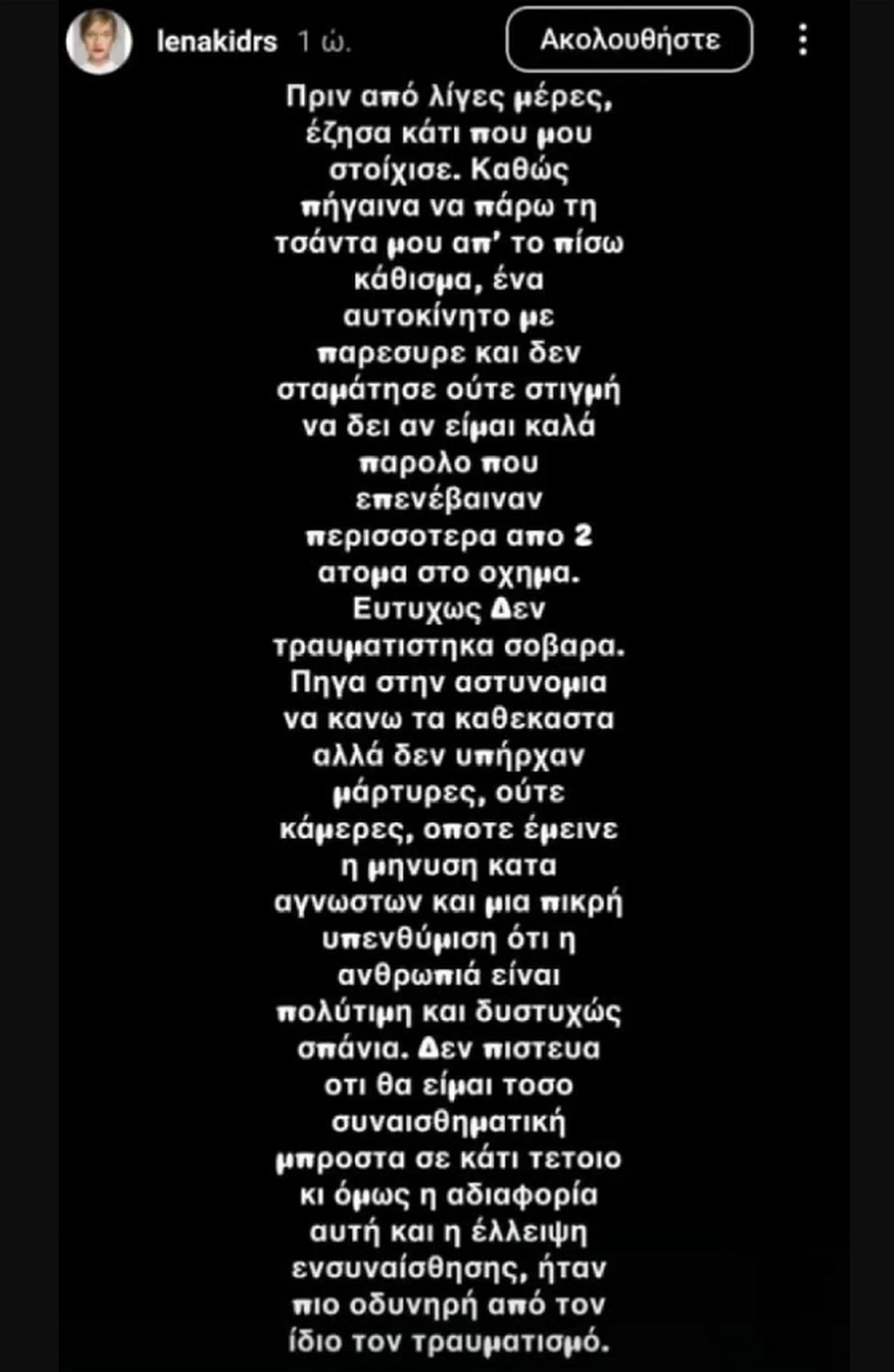 Συγκεκριμένα, η Λένα Δροσάκη έγραψε: «Πριν από λίγες μέρες, έζησα κάτι που μου στοίχισε. Καθώς πήγαινα να πάρω την τσάντα μου απ’ το πίσω κάθισμα, ένα αυτοκίνητο με παρέσυρε και δεν σταμάτησε ούτε στιγμή να δει αν είμαι καλά, παρόλο που επέβαιναν περισσότερα από 2 άτομα στο όχημα.
