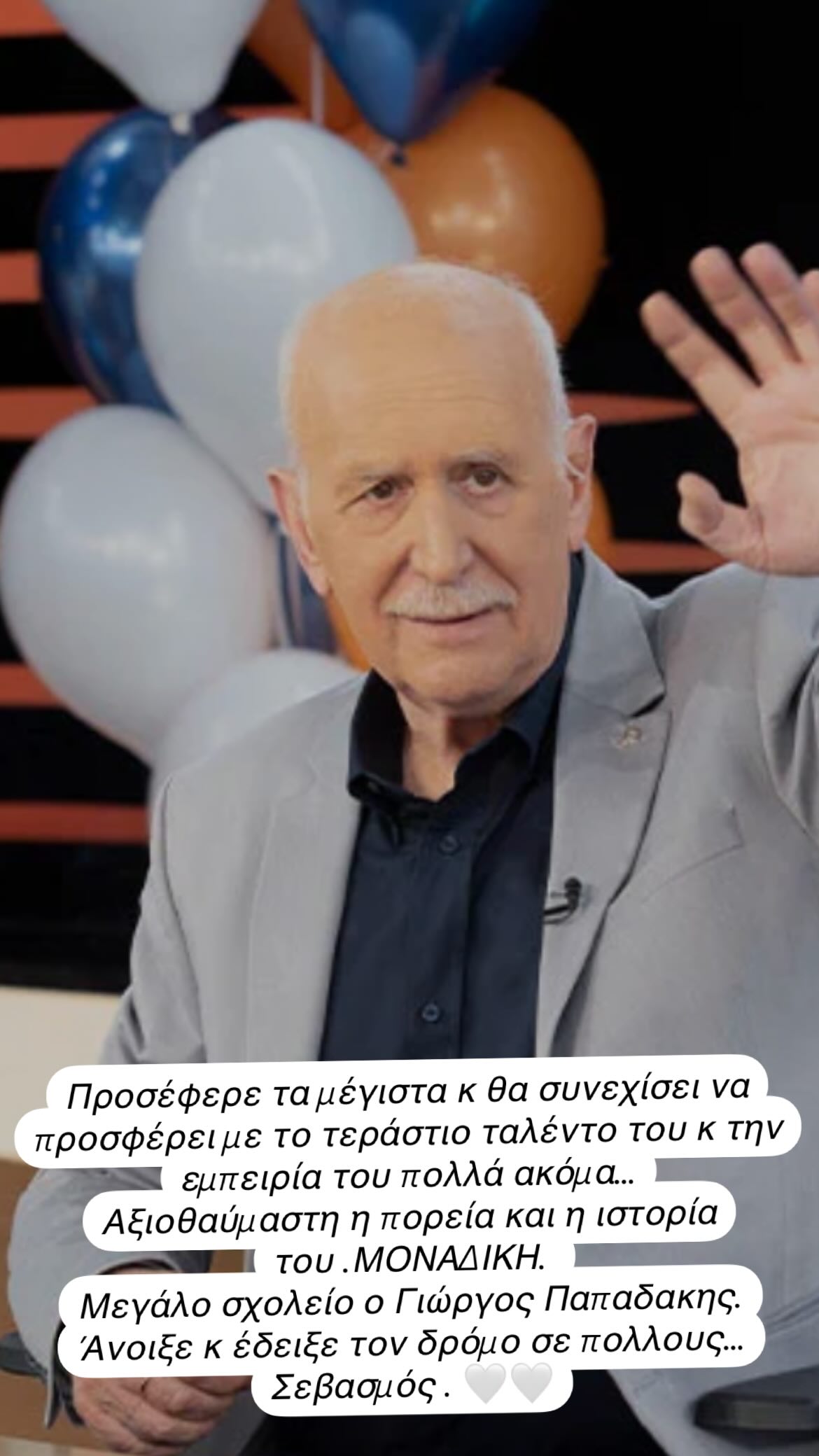 «Προσέφερε τα μέγιστα και θα συνεχίσει να προσφέρει με το τεράστιο ταλέντο του και την εμπειρία του πολλά ακόμα… Αξιοθαύμαστη η πορεία και η ιστορία του. ΜΟΝΑΔΙΚΗ. Μεγάλο σχολείο ο Γιώργος Παπαδάκης. Άνοιξε κ έδειξε τον δρόμο σε πολλούς… Σεβασμός»