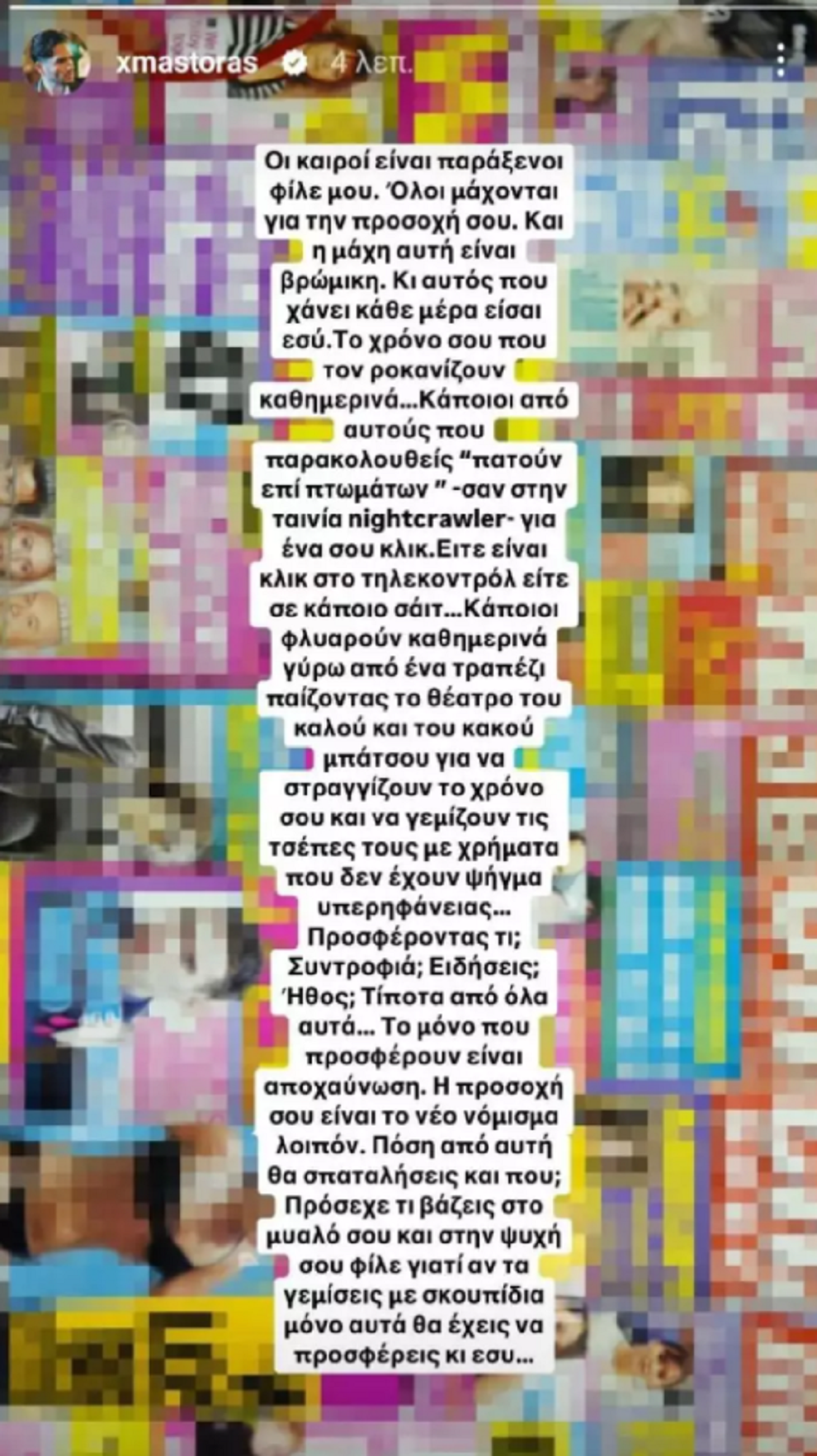 «Οι καιροί είναι παράξενοι φίλε μου. Όλοι μάχονται για την προσοχή σου. Και η μάχη αυτή είναι βρώμικη. Κι αυτός που χάνει κάθε μέρα είσαι εσύ. Τον χρόνο σου που τον ροκανίζουν καθημερινά… Κάποιοι από αυτούς που παρακολουθείς “πατούν επί πτωμάτων” – σαν στην ταινία “Nightcrawler” – για ένα σου κλικ. Είτε είναι κλικ στο τηλεκοντρόλ είτε σε κάποιο site. Κάποιοι φλυαρούν καθημερινά γύρω από ένα τραπέζι παίζοντας το θέατρο του καλού και του κακού μπάτσου για να στραγγίζουν τον χρόνο σου και να γεμίζουν τις τσέπες τους με χρήματα που δεν έχουν ψήγμα υπερηφάνειας…