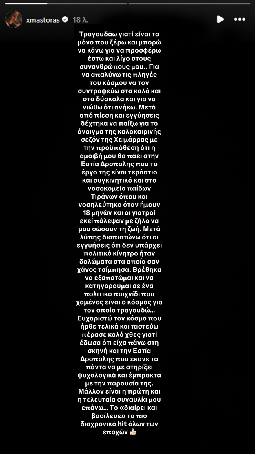 Σε ανάρτηση που έκανε στο Instagram για να εξηγήσει την πρόσφατη «αστοχία» του λοιπόν, έγραψε ότι «τσίμπησε» σαν «χάνος» στις «εγγυήσεις ότι δεν υπάρχει πολιτικό κίνητρο» και τόνισε ότι ήταν «η πρώτη και τελευταία συναυλία επάνω».
