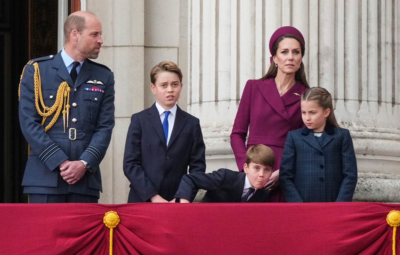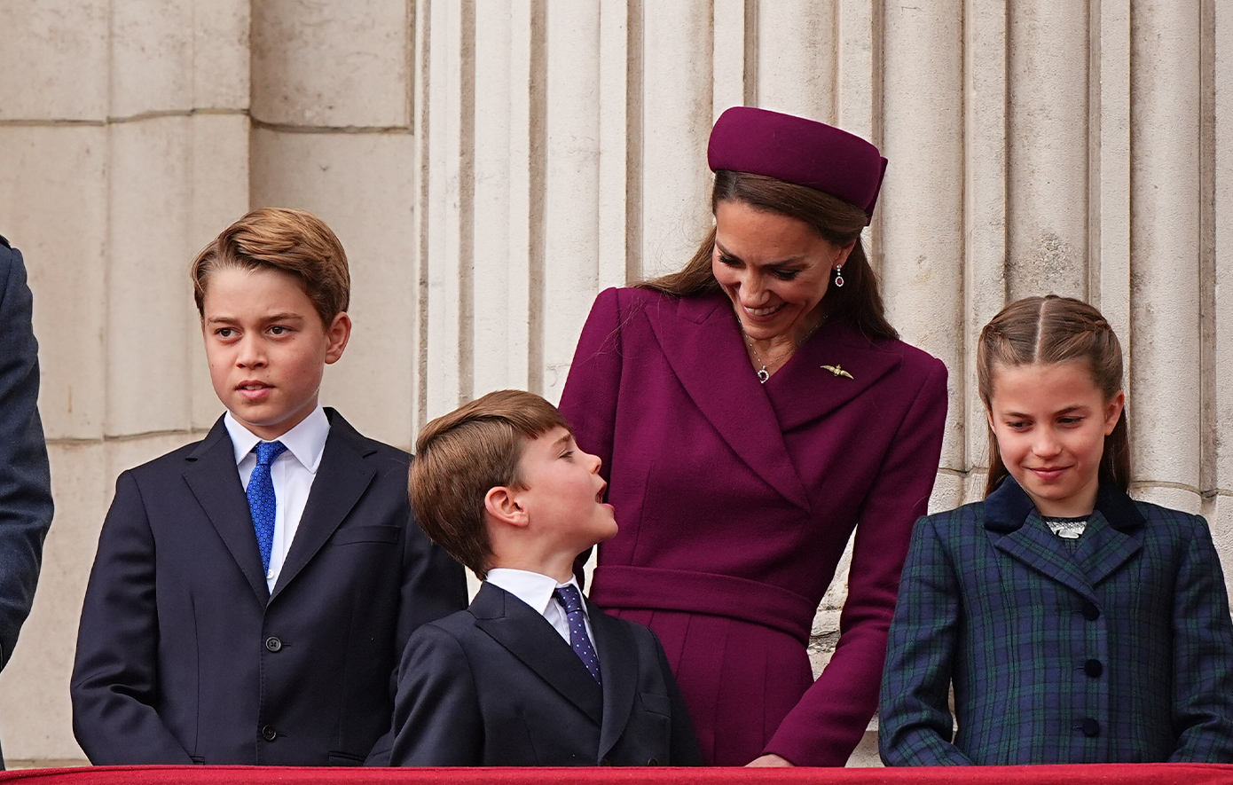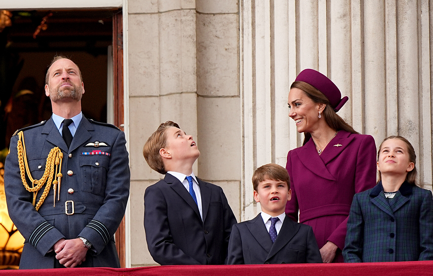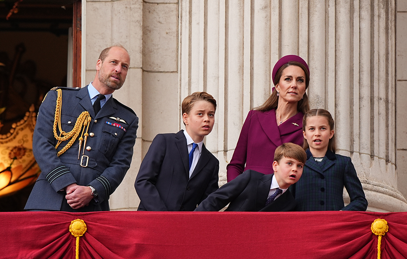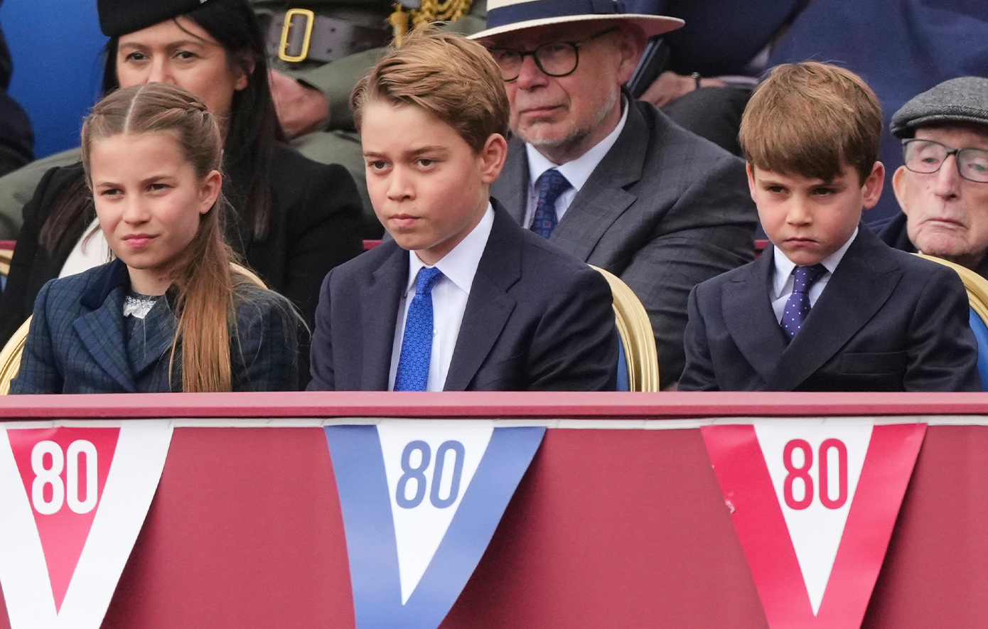 Χθες, ολόκληρη η οικογένεια παρακολούθησε την παρέλαση, με τον εντεκάχρονο Τζορτζ, τη δεκάχρονη Σάρλοτ και τον επτάχρονο Λούις να στέκονται στην πρώτη σειρά του Μνημείου της Βασίλισσας Βικτωρίας δίπλα στους γονείς τους.
