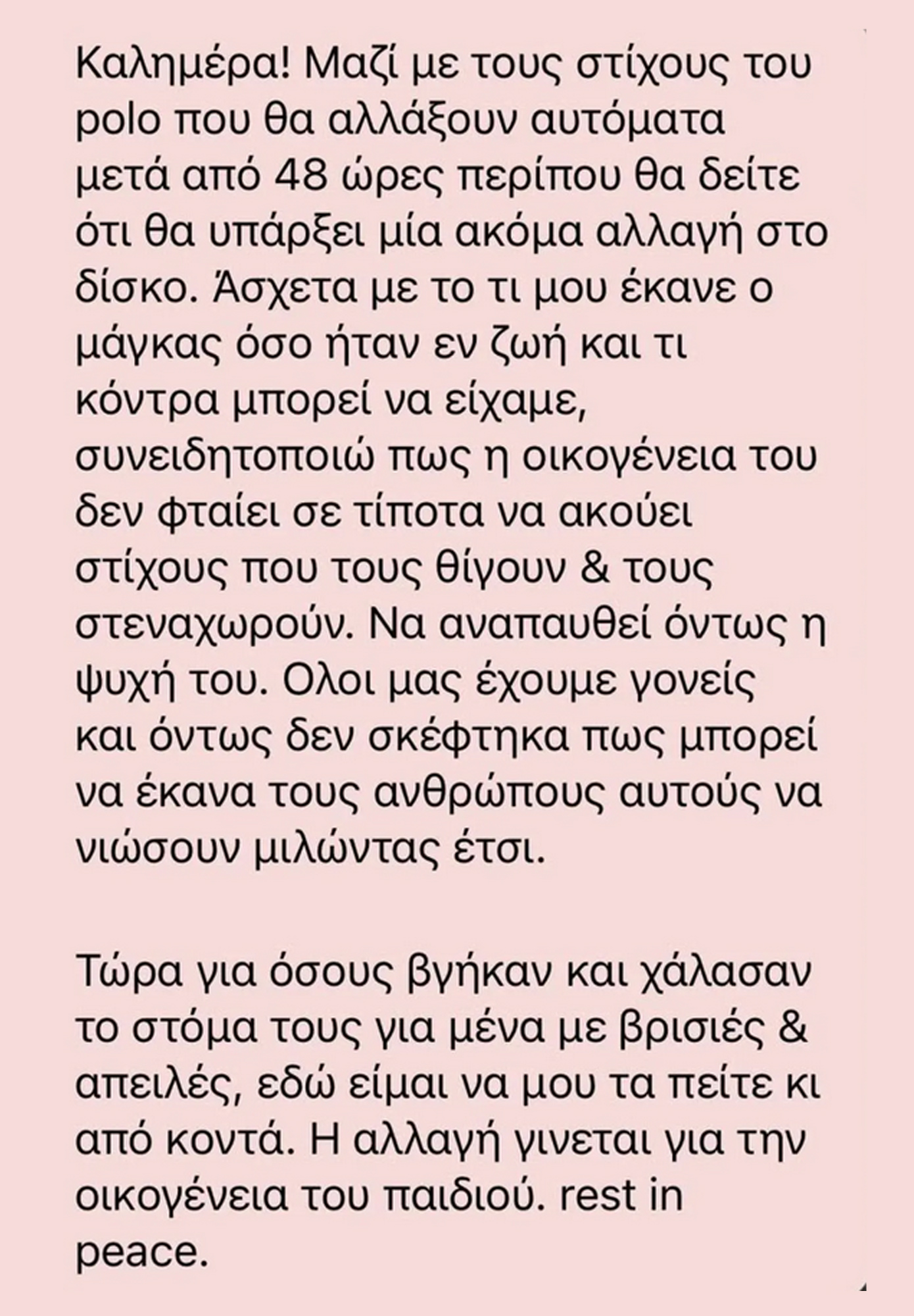 «Καλημέρα! Μαζί με τους στίχους του Polo που θα αλλάξουν αυτόματα μετά από 48 ώρες περίπου θα δείτε ότι θα υπάρξει μία ακόμα αλλαγή στο δίσκο. Άσχετα με το τι μου έκανε ο μάγκας όσο ήταν εν ζωή και τι κόντρα μπορεί να είχαμε, συνειδητοποιώ πως η οικογένεια του δεν φταίει σε τίποτα να ακούει στίχους που τους θίγουν & τους στεναχωρούν. Να αναπαυθεί όντως η ψυχή του. Όλοι μας έχουμε γονείς και όντως δεν σκέφτηκα πως μπορεί να έκανα τους ανθρώπους αυτούς να νιώσουν μιλώντας έτσι.Τώρα για όσους βγήκαν και χάλασαν το στόμα τους για μένα με βρισιές & απειλές, εδώ είμαι να μου τα πείτε κι από κοντά. Η αλλαγή γίνεται για την οικογένεια του παιδιού. rest in peace», αναφέρει ο Light.