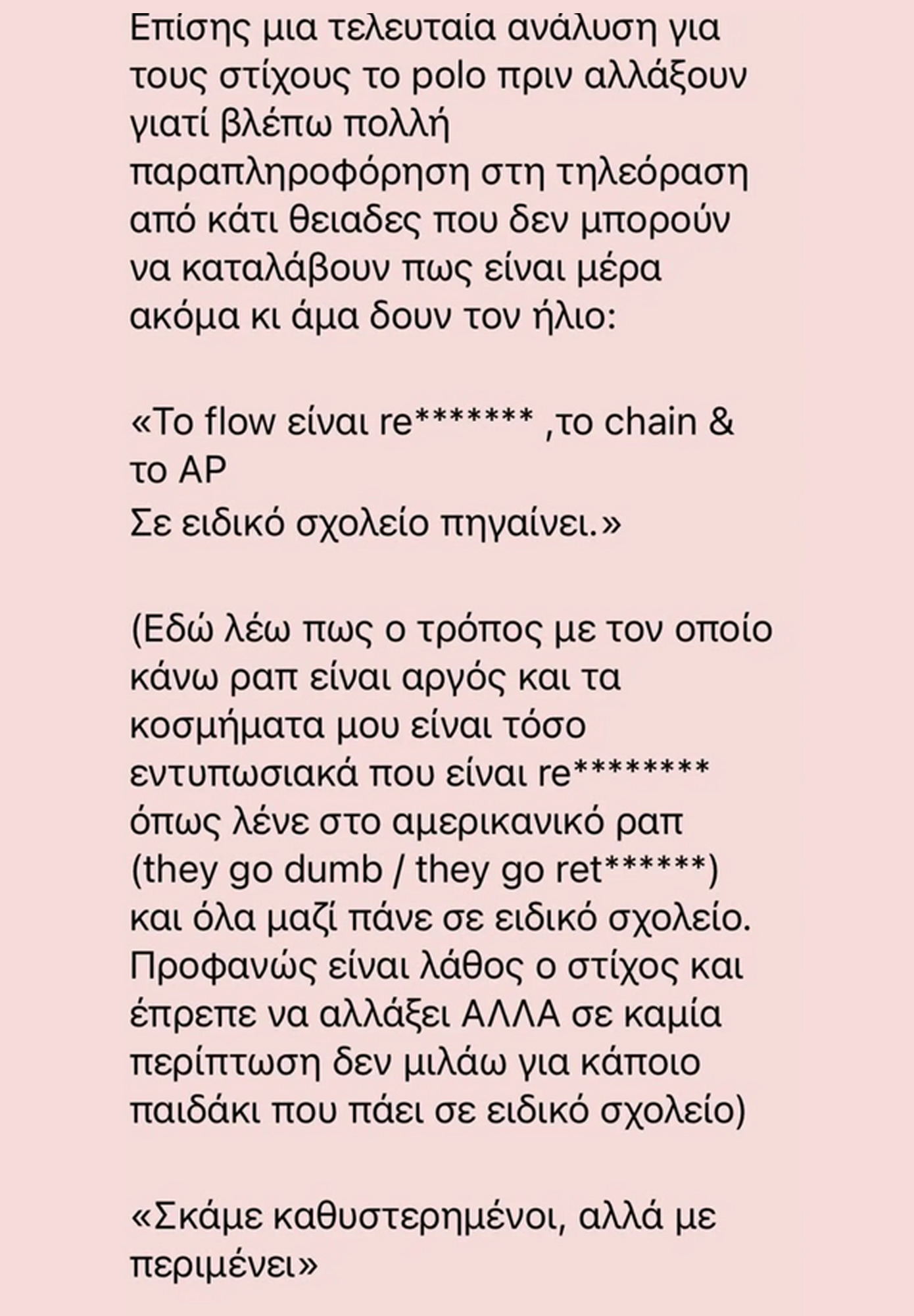 «Επίσης μια τελευταία ανάλυση για τους στίχους το Polo πριν αλλάξουν γιατί βλέπω πολλή παραπληροφόρηση στη τηλεόραση από κάτι θειάδες που δεν μπορούν να καταλάβουν πως είναι μέρα ακόμα κι άμα δουν τον ήλιο:
