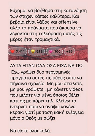 «Εύχομαι να βοήθησα στη κατανόηση των στίχων κάπως καλύτερα. Και βέβαια είναι λάθος και offensive αλλά τα πράγματα που άκουσα να λέγονται στη τηλεόραση αυτές τις μέρες ήταν τρομαχτικά.