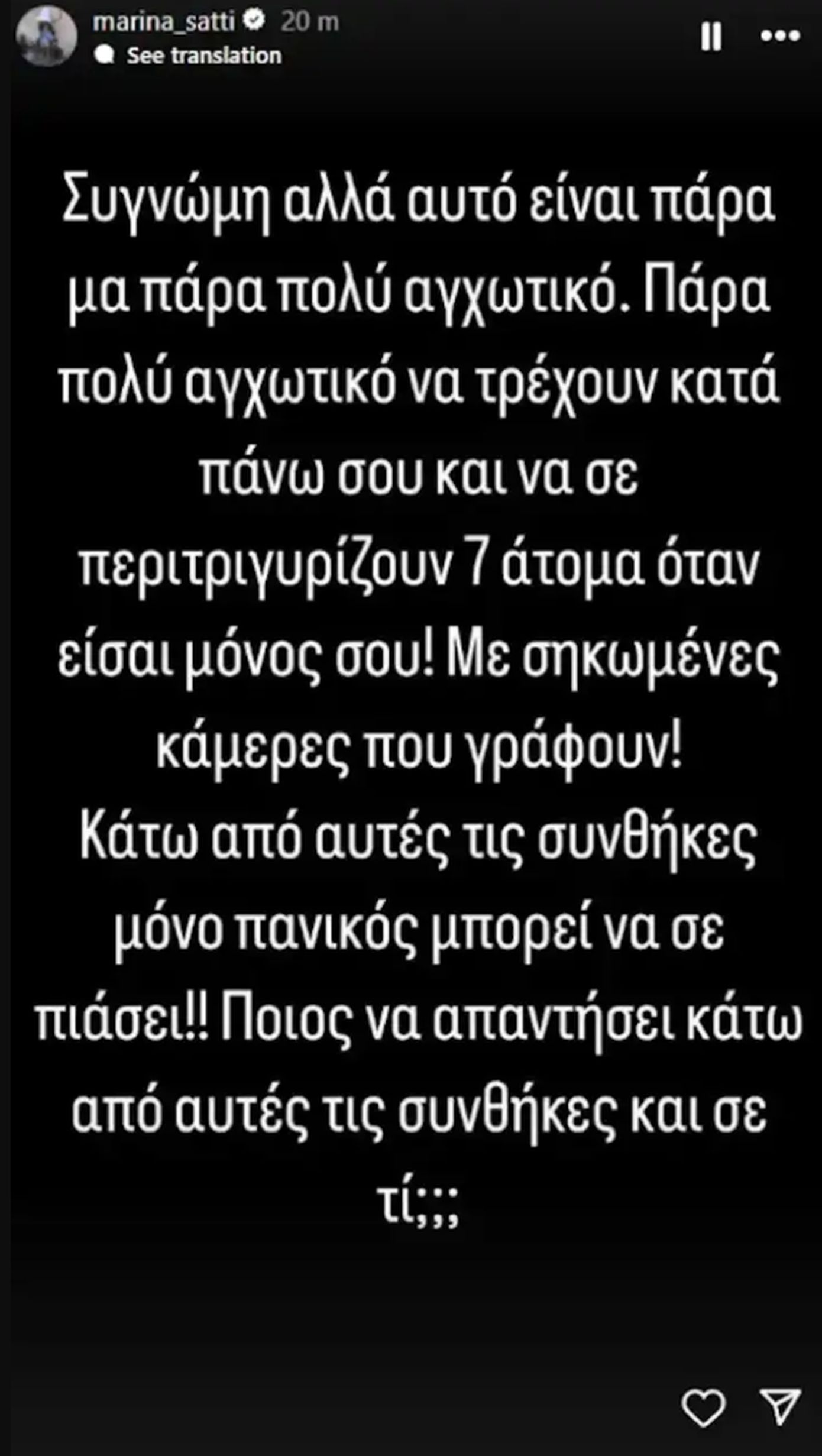 Αργότερα η Μαρίνα Σάττι επέστρεψε με νέο μήνυμα περιγράφοντας τον πανικό που βίωσε όταν 7 άτομα έσπευσαν δίπλα της για να εξασφαλίσουν δηλώσεις της στις κάμερες.