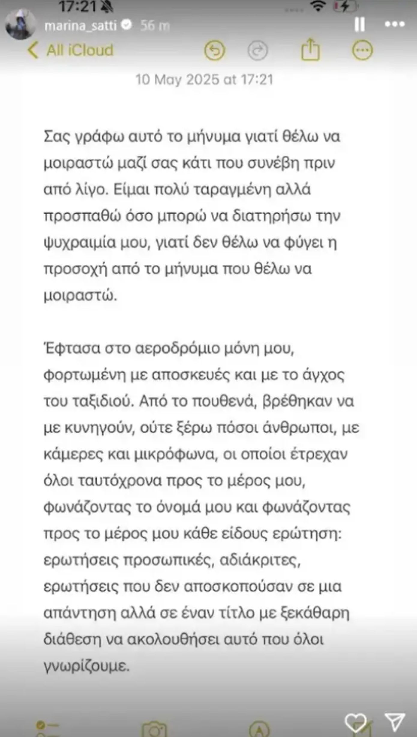 Έφτασα στο αεροδρόμιο μόνη μου, φορτωμένη με αποσκευές και με το άγχος του ταξιδιού. Από το πουθενά, βρέθηκαν να με κυνηγούν, ούτε ξέρω πόσοι άνθρωποι, με κάμερες και μικρόφωνα, οι οποίοι έτρεχαν όλοι ταυτόχρονα προς το μέρος μου, φωνάζοντας το όνομά μου και φωνάζοντας προς το μέρος μου κάθε είδους ερώτηση», αναφέρει, μεταξύ άλλων, η Μαρίνα Σάττι στην πρώτη από τις αναρτήσεις που έκανε.