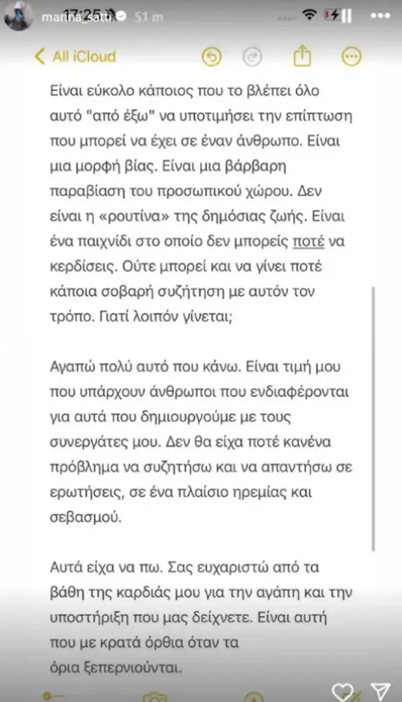 Είναι ένα παιχνίδι στο οποίο δεν μπορείς ποτέ να κερδίσεις. Ούτε μπορεί και να γίνει ποτέ σοβαρή συζήτηση με αυτόν τον τρόπο. Γιατί λοιπόν γίνεται;» αναφέρει σε άλλο σημείο της ανάρτησής της η Μαρίνα Σάττι.