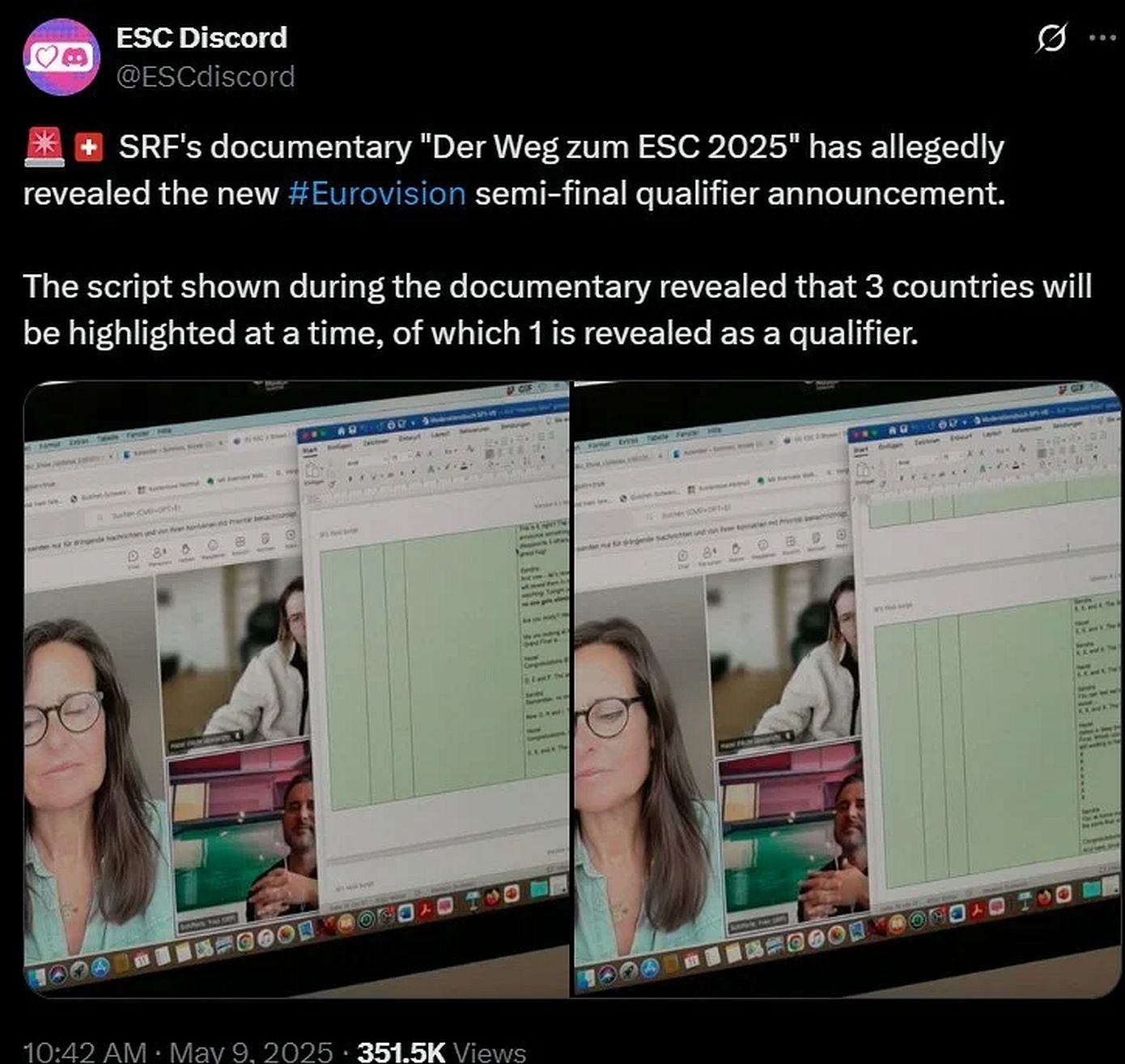 Η πληροφορία έρχεται μέσα από το ντοκιμαντέρ της SRF «Der Weg zum ESC 2025» («Ο δρόμος προς τη Eurovision 2025»), στο οποίο φέρεται να αποκαλύπτεται το νέο format ανακοίνωσης των προκρίσεων στους ημιτελικούς. Όπως ανέφερε το ESC Discord, στο σενάριο που εμφανίζεται στο ντοκιμαντέρ γίνεται λόγος για παρουσίαση των χωρών σε ομάδες των τριών, από τις οποίες προκρίνεται μόνο μία, εντείνοντας το σασπένς.
