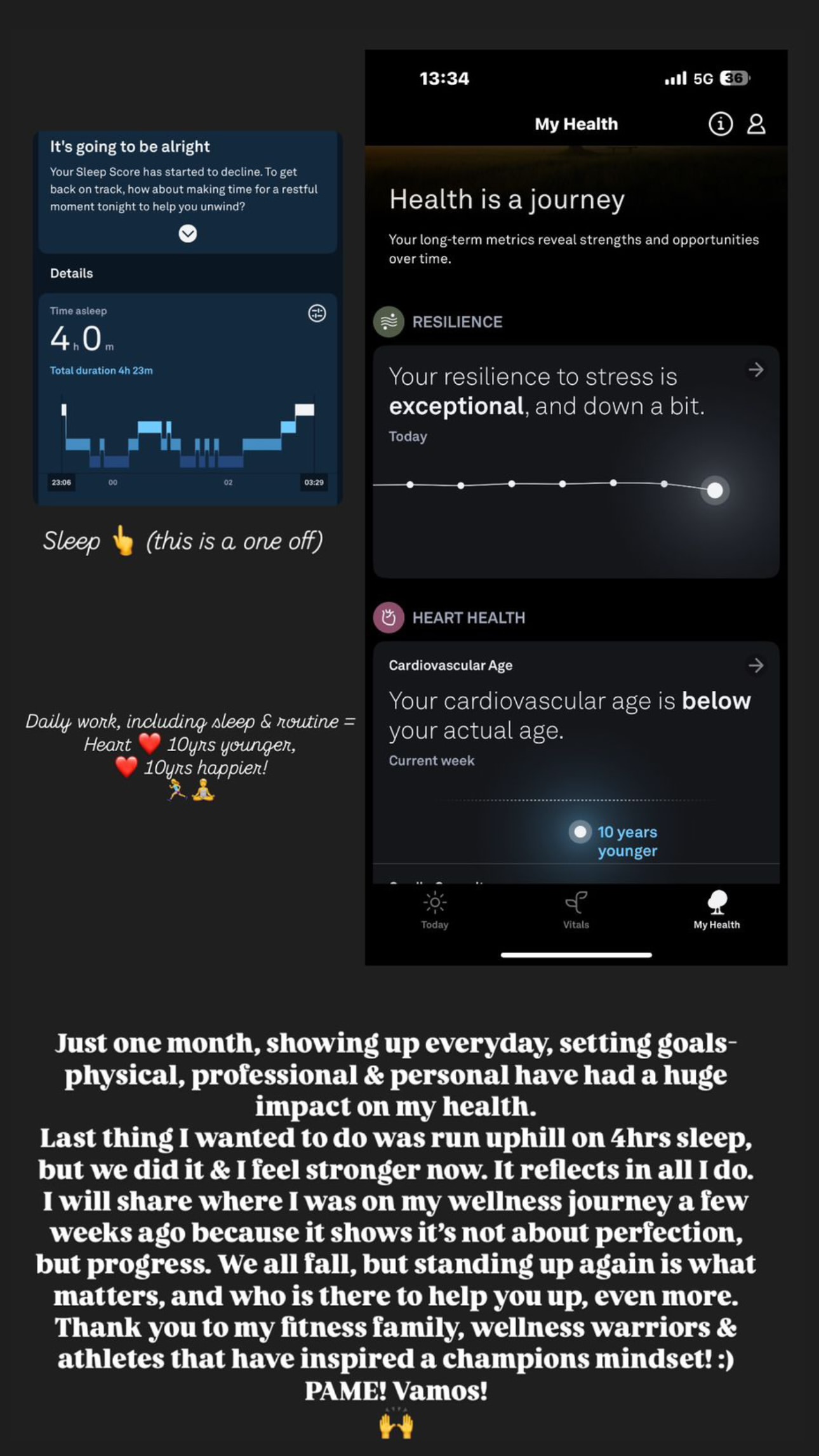 «Μόλις ένας μήνας, το να εμφανίζομαι καθημερινά, να βάζω στόχους – σωματικούς, επαγγελματικούς και προσωπικούς, είχαν τεράστιο αντίκτυπο στην υγεία μου. Το τελευταίο πράγμα που ήθελα να κάνω ήταν να τρέξω στην ανηφόρα με ύπνο 4 ωρών, αλλά τα καταφέραμε και νιώθω πιο δυνατη τώρα. Αντανακλά σε ό,τι κάνω. Θα μοιραστώ πού ήμουν στο ταξίδι ευεξίας μου πριν από μερικές εβδομάδες γιατί δείχνει ότι δεν πρόκειται για την τελειότητα, αλλά για την πρόοδο. Όλοι πέφτουμε, αλλά το να σηκωθείς ξανά είναι αυτό που έχει σημασία, και ποιος είναι εκεί για να σε βοηθήσει να σηκωθείς, ακόμα περισσότερο. Ευχαριστώ τη γυμναστική μου οικογένεια, τους πολεμιστές ευεξίας και τους αθλητές που έχουν εμπνεύσει μια νοοτροπία πρωταθλητών! »