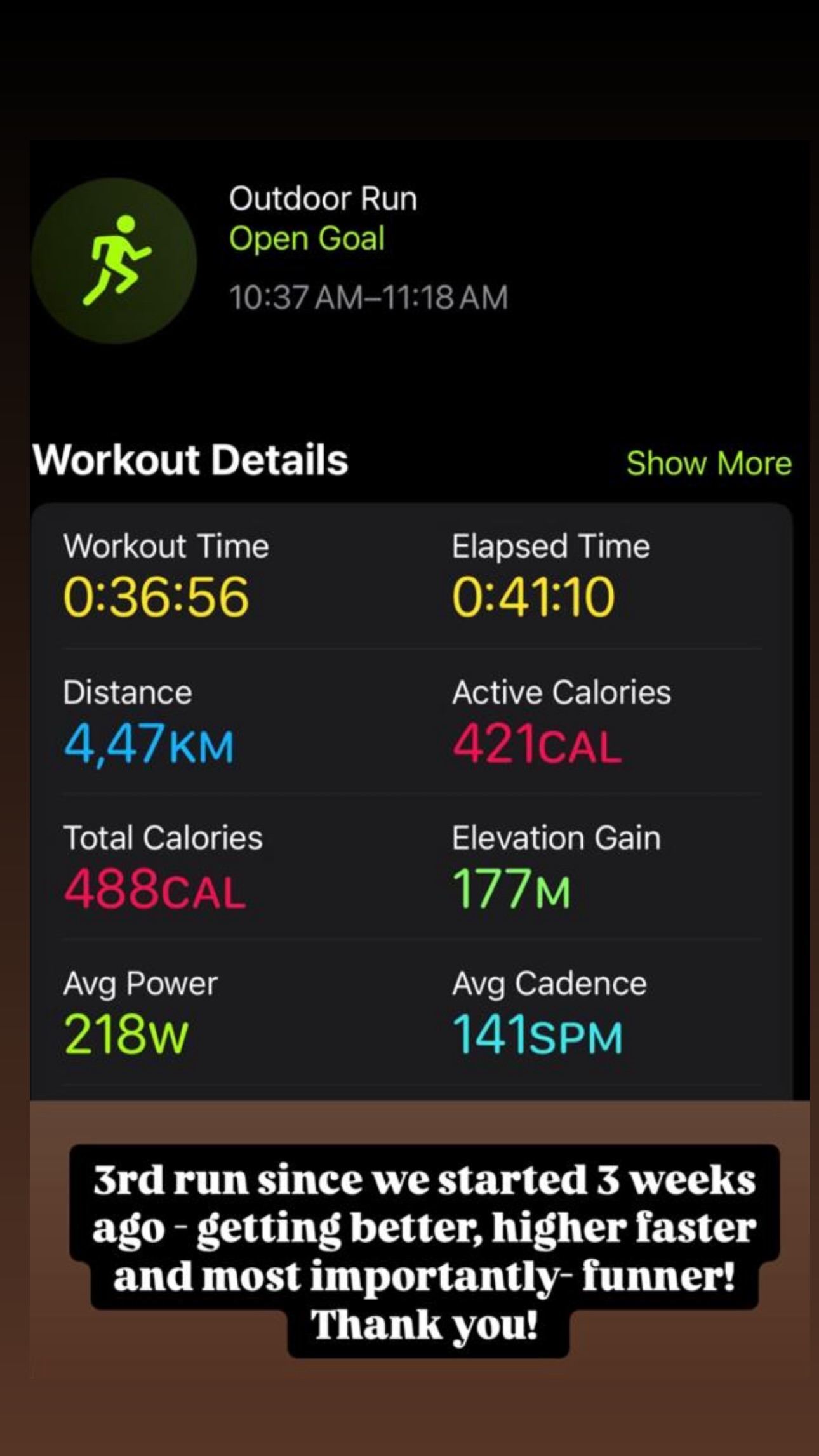 Στο δεύτερο Instagram story αναφέρει πως είναι η τρίτη φορά που τρέχει τις τελευταίες τρεις εβδομάδες και όπως λέει, μέσα σε αυτό το διάστημα γίνεται καλύτερη και πιο γρήγορη, ενώ η διαδικασία γίνεται όλο και πιο διασκεδαστική.