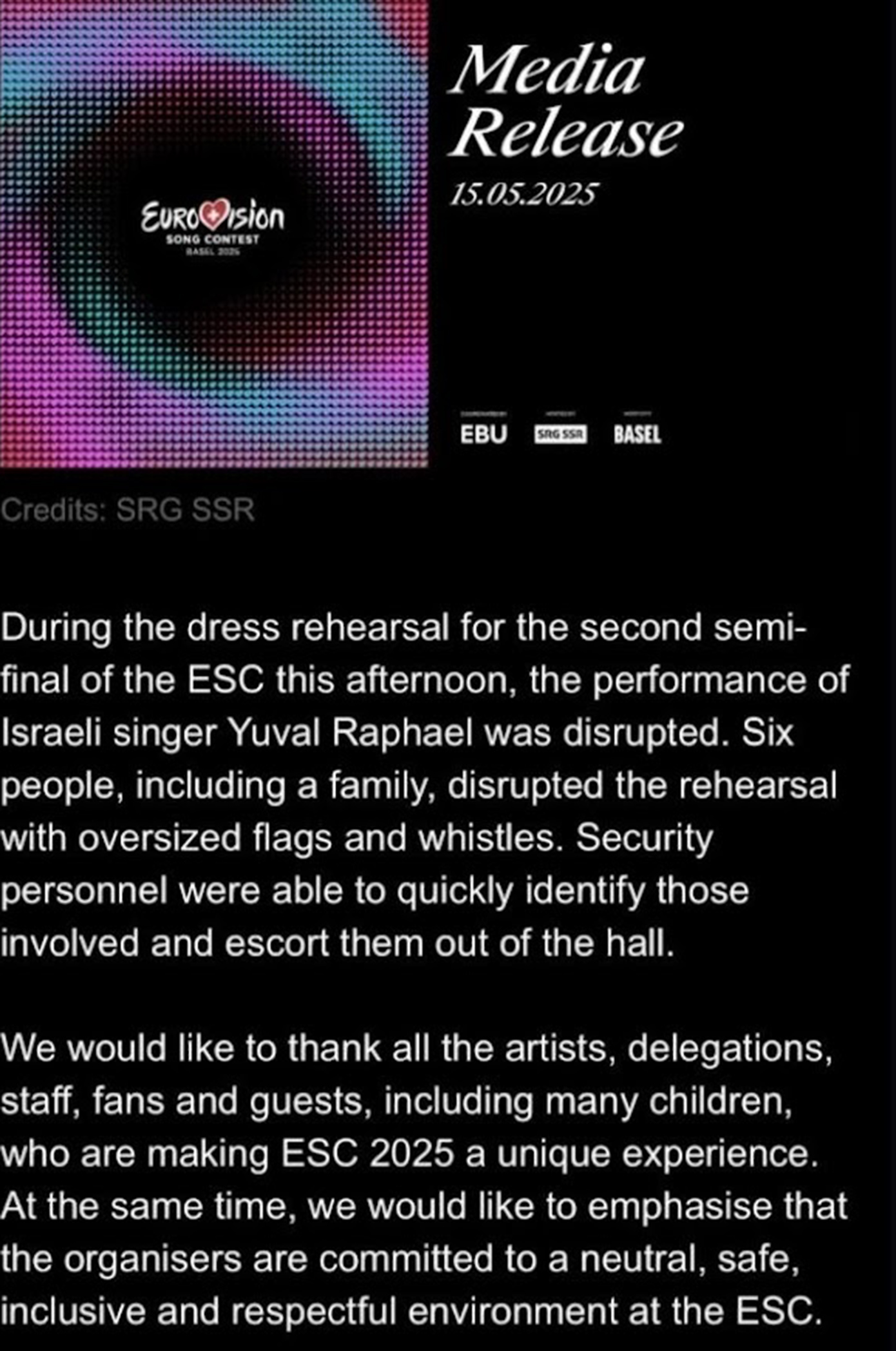 «Θα θέλαμε να ευχαριστήσουμε όλους τους καλλιτέχνες, τις αντιπροσωπείες, το προσωπικό, τους θαυμαστές και τους επισκέπτες, συμπεριλαμβανομένων πολλών παιδιών, που καθιστούν τη Eurovision 2025 μια μοναδική εμπειρία. Ταυτόχρονα, θα θέλαμε να τονίσουμε ότι οι διοργανωτές της Eurovision 2025 δεσμεύονται για ένα ουδέτερο, ασφαλές, χωρίς αποκλεισμούς και με σεβασμό περιβάλλον», αναφέρουν οι διοργανωτές της Eurovision.